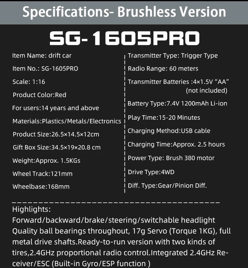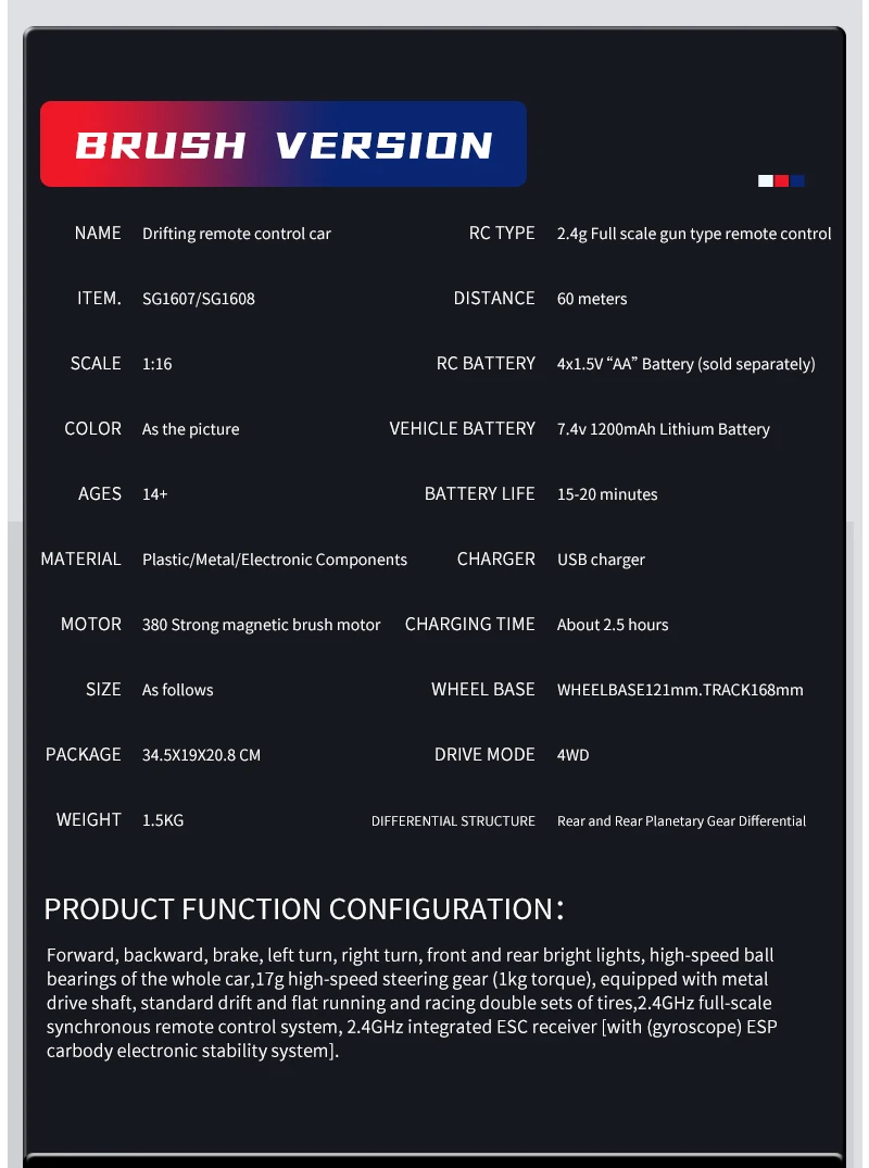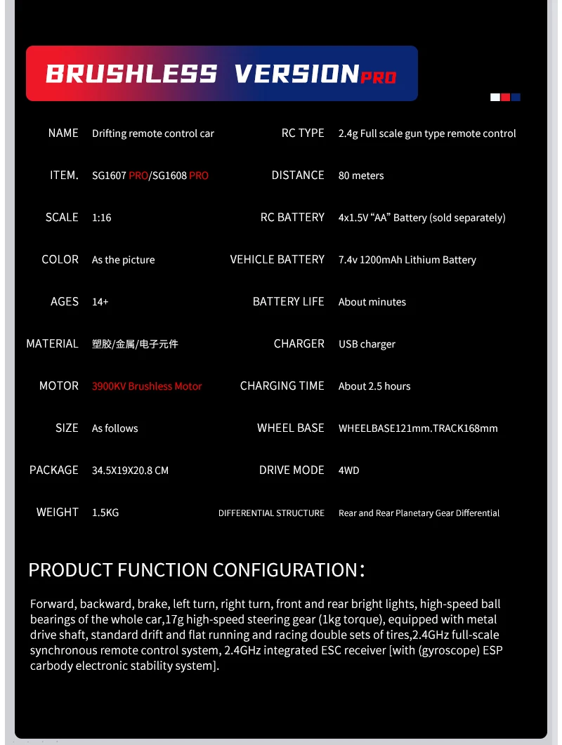 2023 New SG1607 SG1605 SG1606 UD1607 UD1608 Pro 1/16 RC Car High Speed 2.4G Brushless 4WD Drift Remote Control Racing Car toys For Boys
