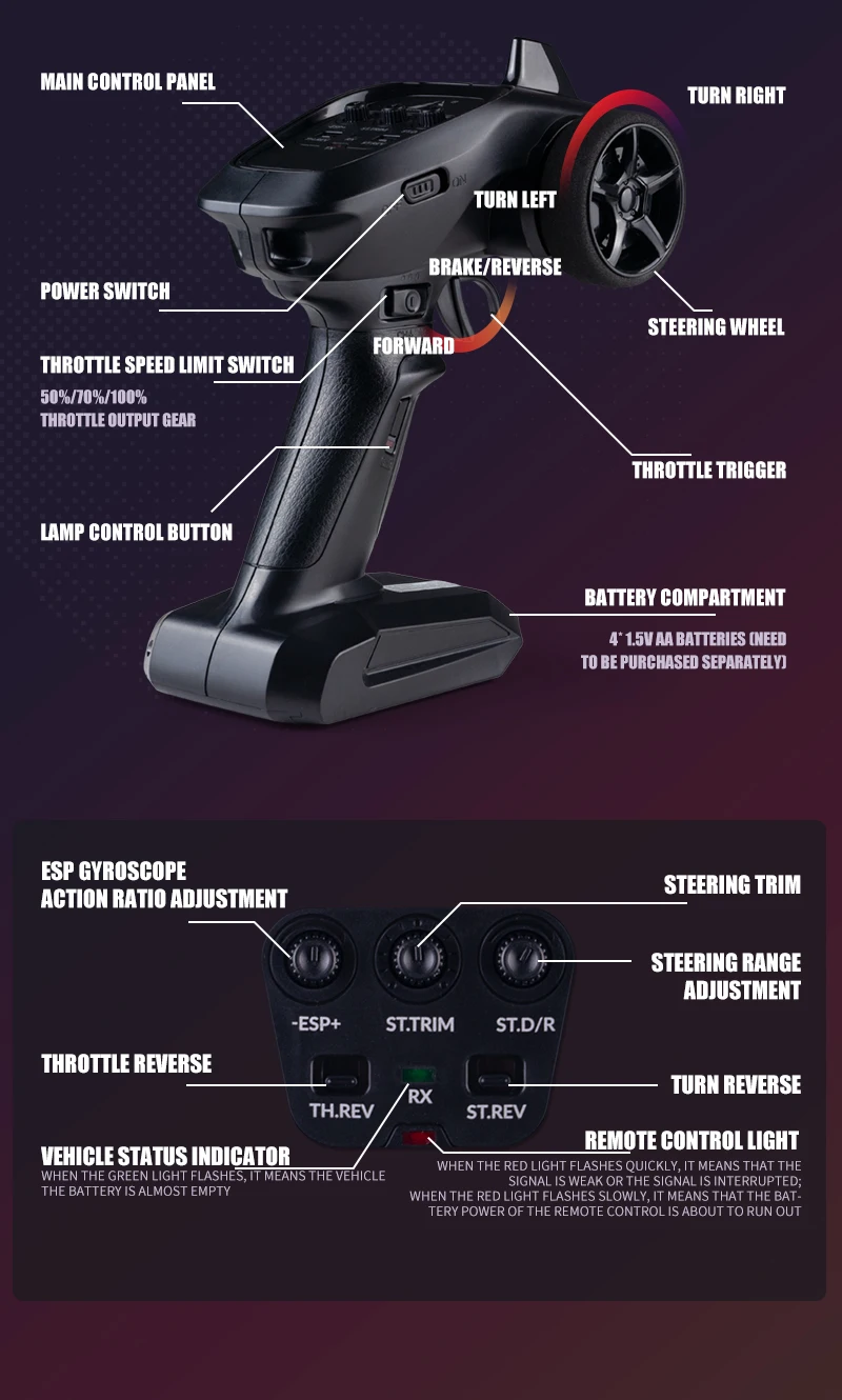 ● This model is equipped with full-scale synchronous control functions such as forward, backward, left and right turning, braking, etc., as well as battery overcharge protection and overcurrent protection.