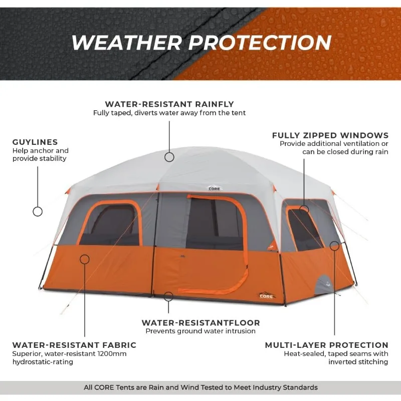 - Weather Protection: H20 Block Technology with 1200mm water-repellent fabric, fully taped rainfly, sealed seams, and fully zipped windows; includes guylines and steel stakes for enhanced stability