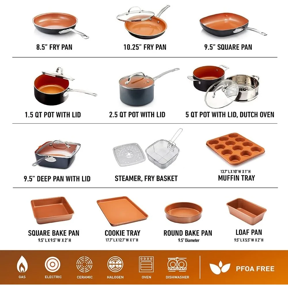 - Complete Kitchen In A Box: Includes everything you need to completely outfit your kitchen and take cooking and baking to the next level, includes a full cookware set with frying pans, skillets, saucepans, stock pots with tempered glass lids, a deep frying and casserole pan with a steamer tray, fry basket and lid plus a complete PRO baking set with cookie sheet/jelly roll pan, loaf pan, muffin tin, square pan and more!