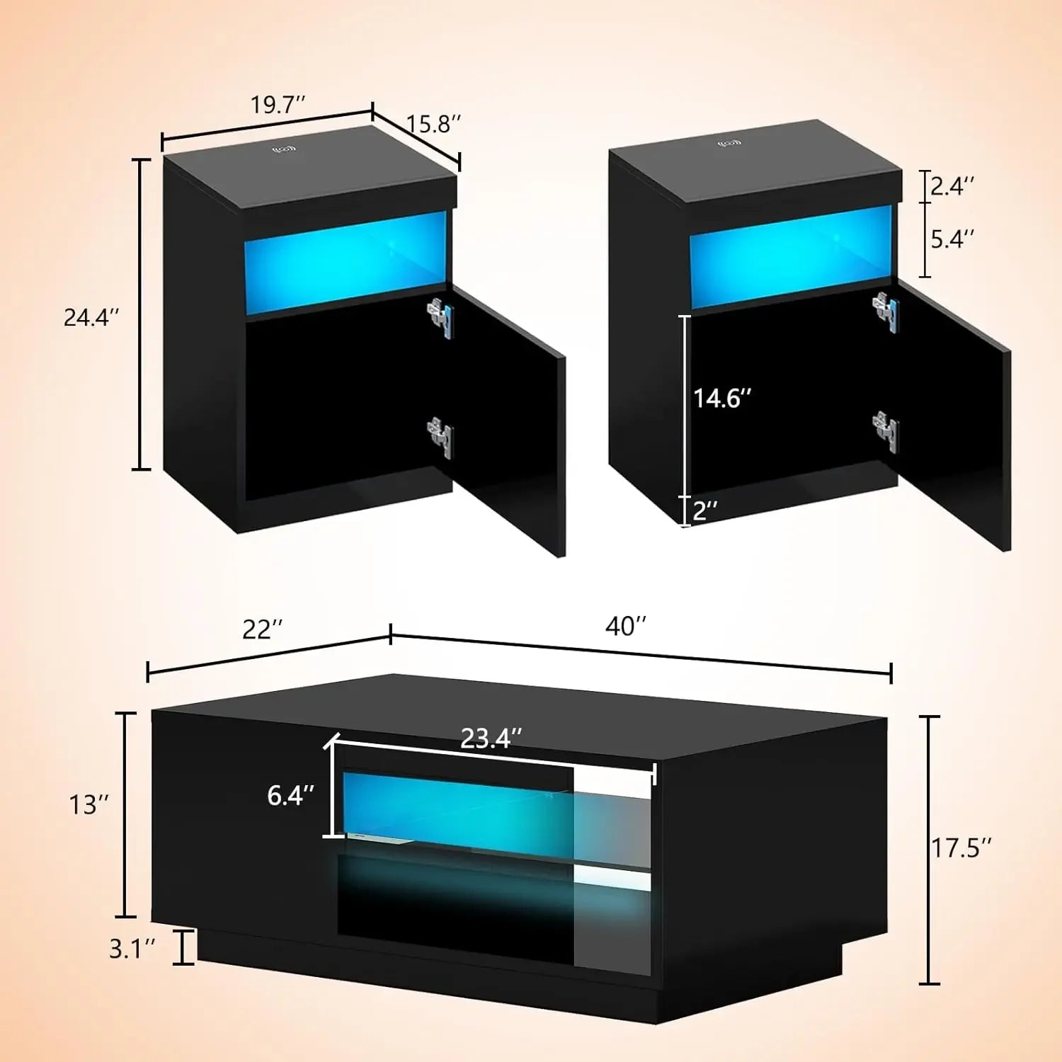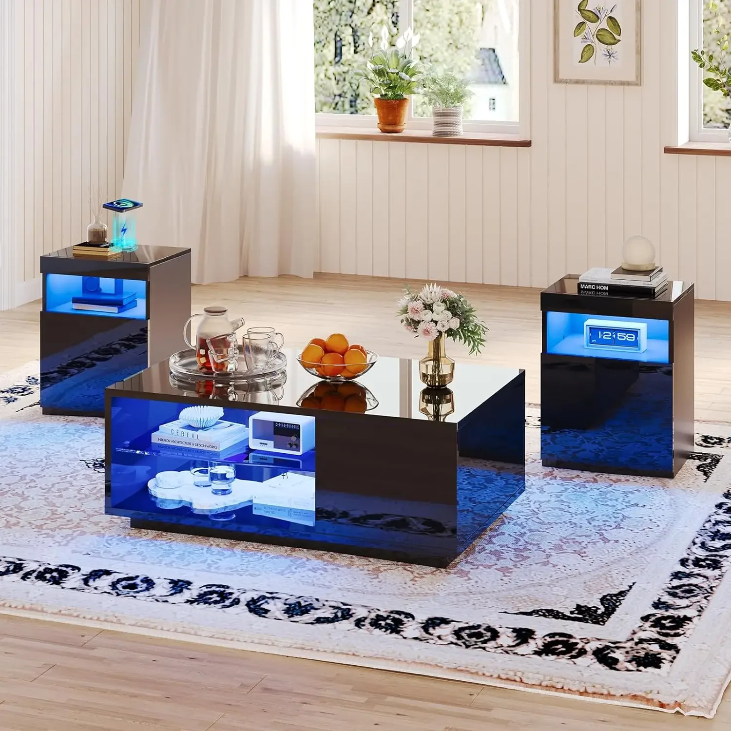 3-Piece Table Set, Coffee Table with 20-Color LED Lights, 2 End Tables with Wireless Charging Station