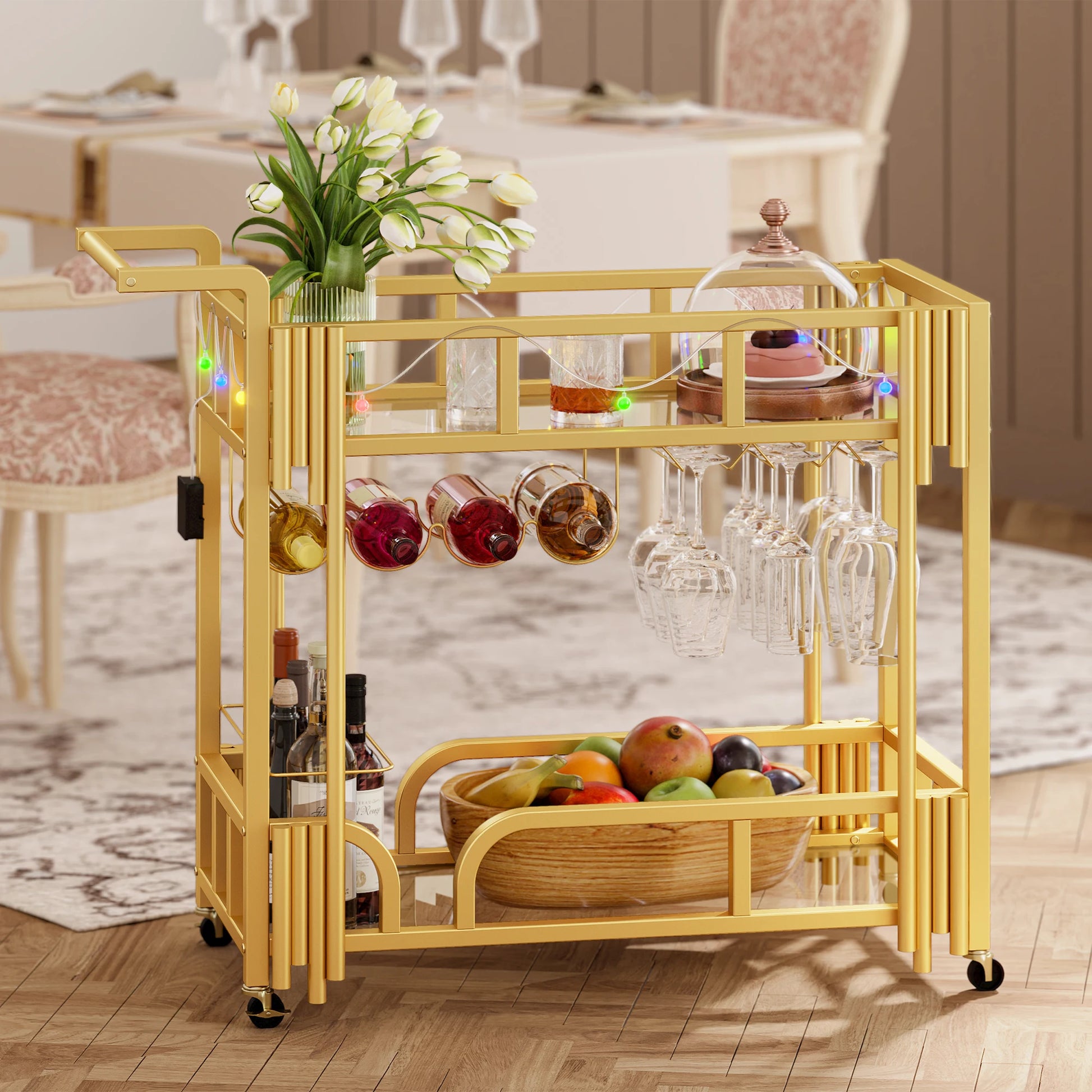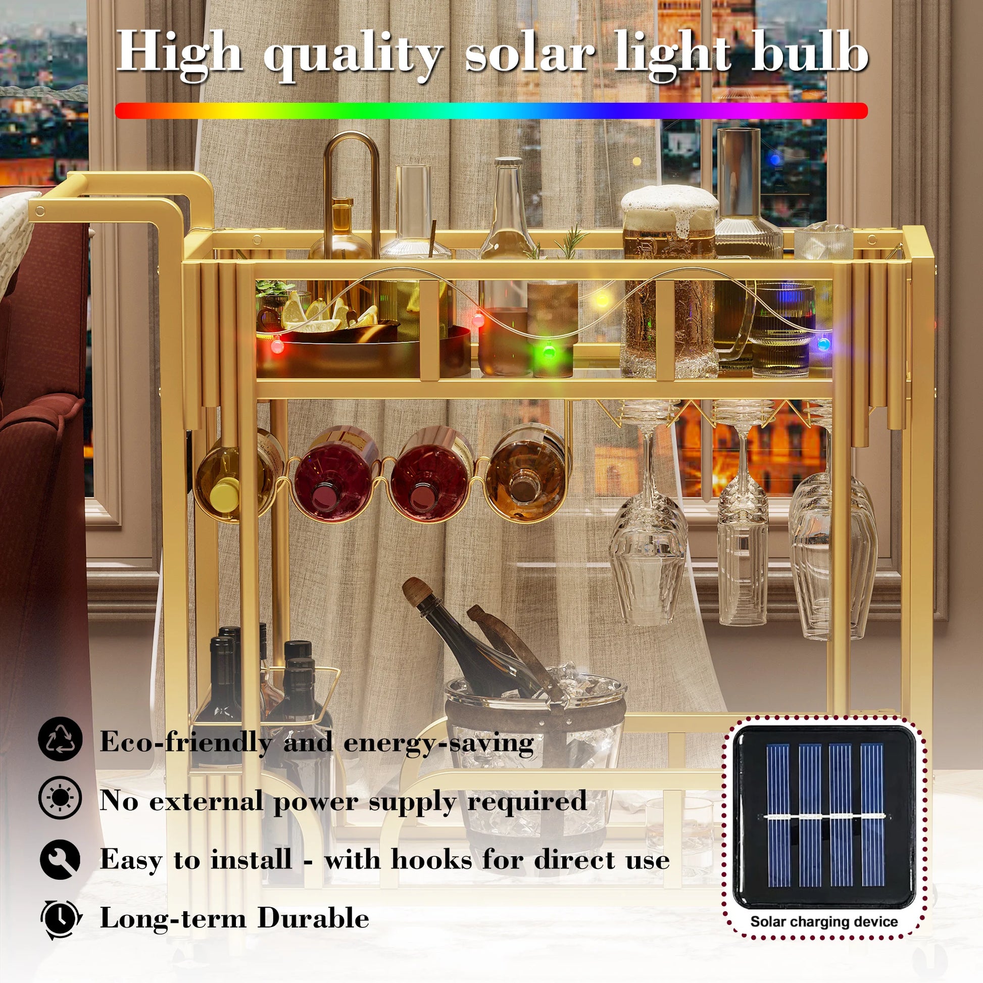 SHINY GOLDEN & BULBS - This bar cart boasts a dazzling gold finish and solar-powered bulbs that will enhance any interior decor, on display while perking up your bar area, dining room, or kitchen, making it perfect for starting a romantic dinner