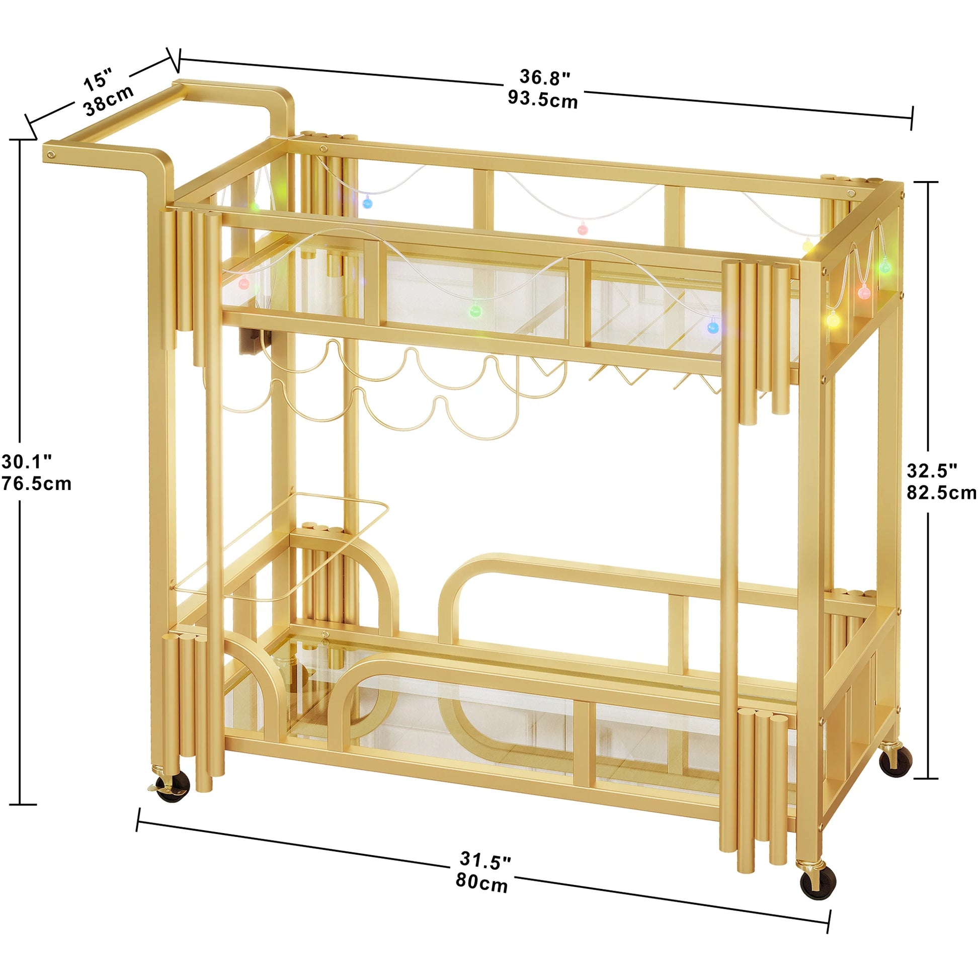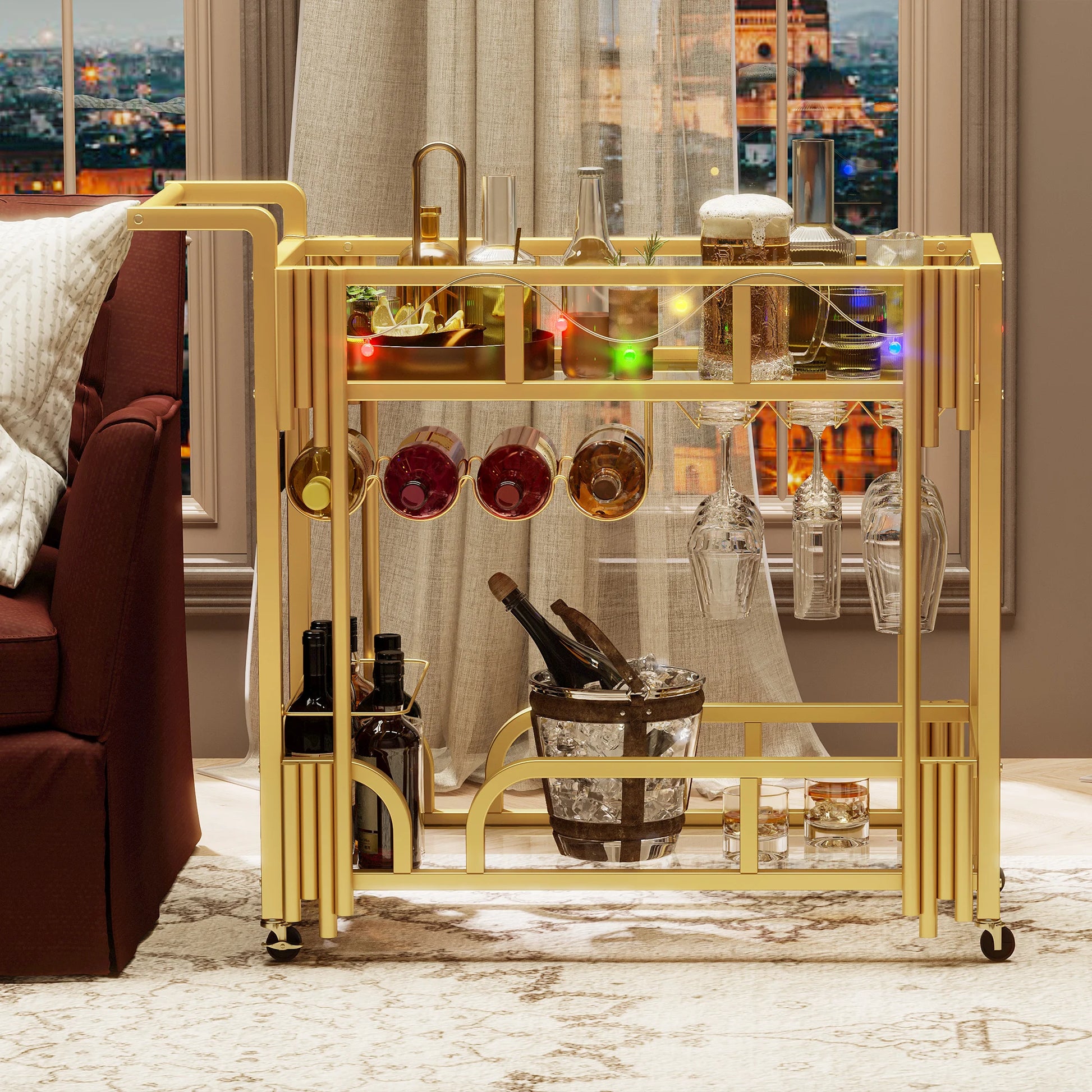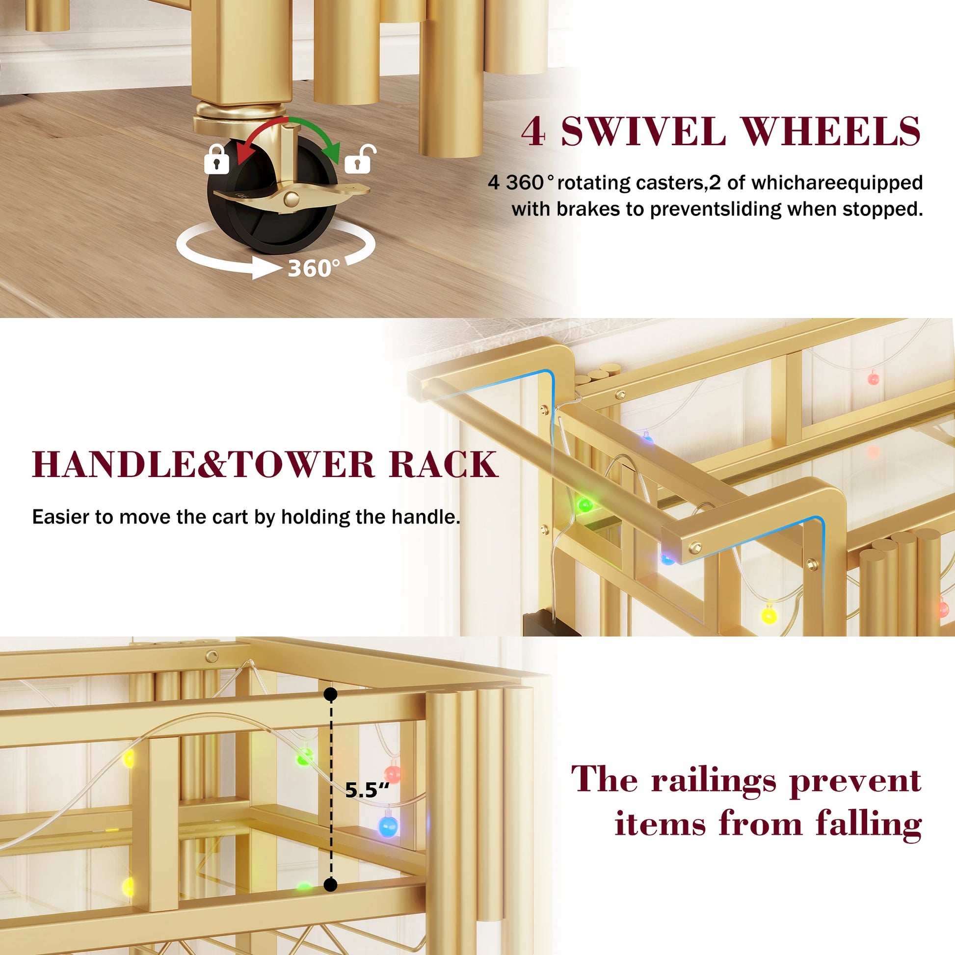 Bar Cart Gold, Home Bar Serving Cart with Led Bulb and Wine Rack Glass Holders,