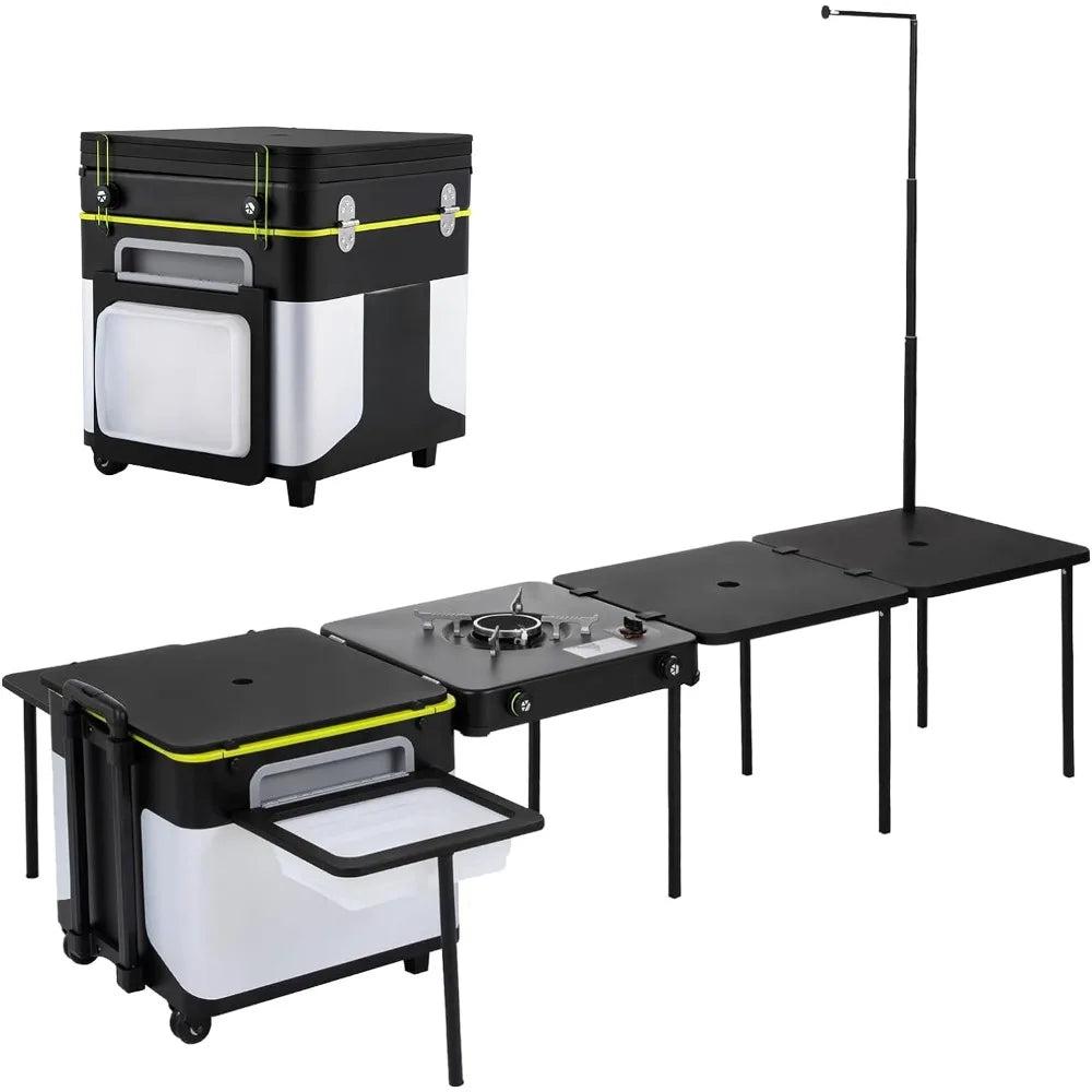 Camping table, outdoor cooking station multifunctional integrated box with wheels and windproof stove portable folding table
