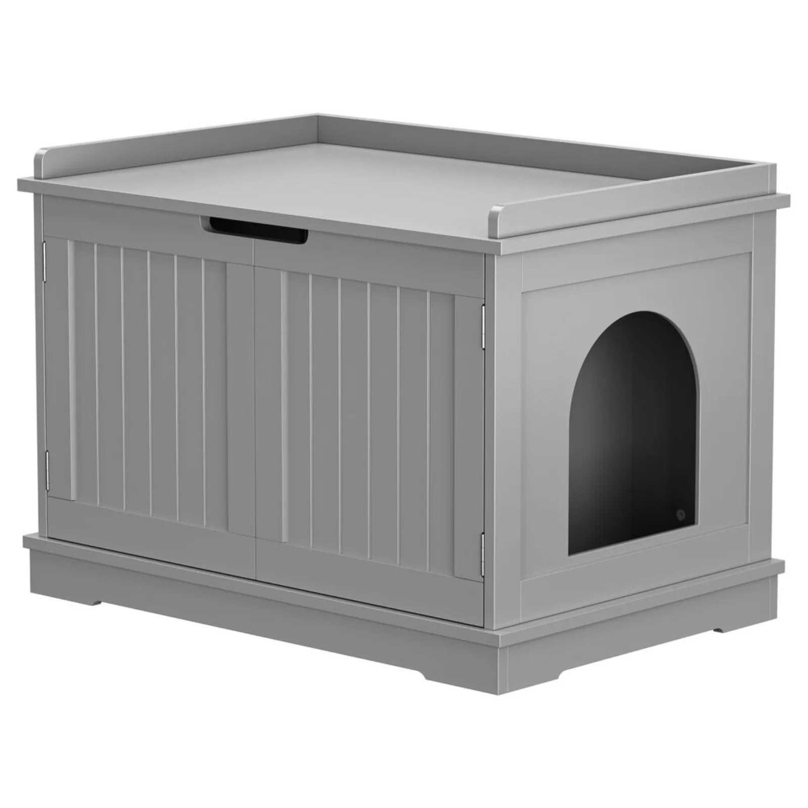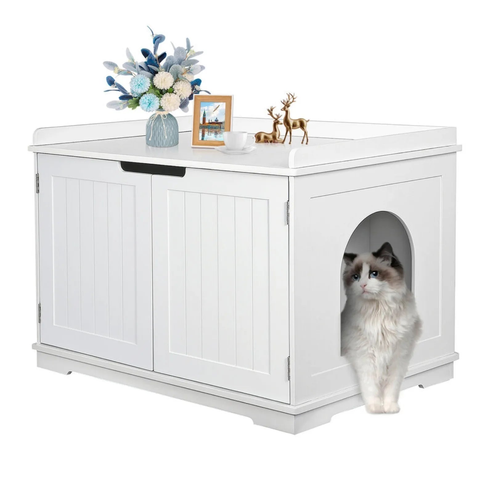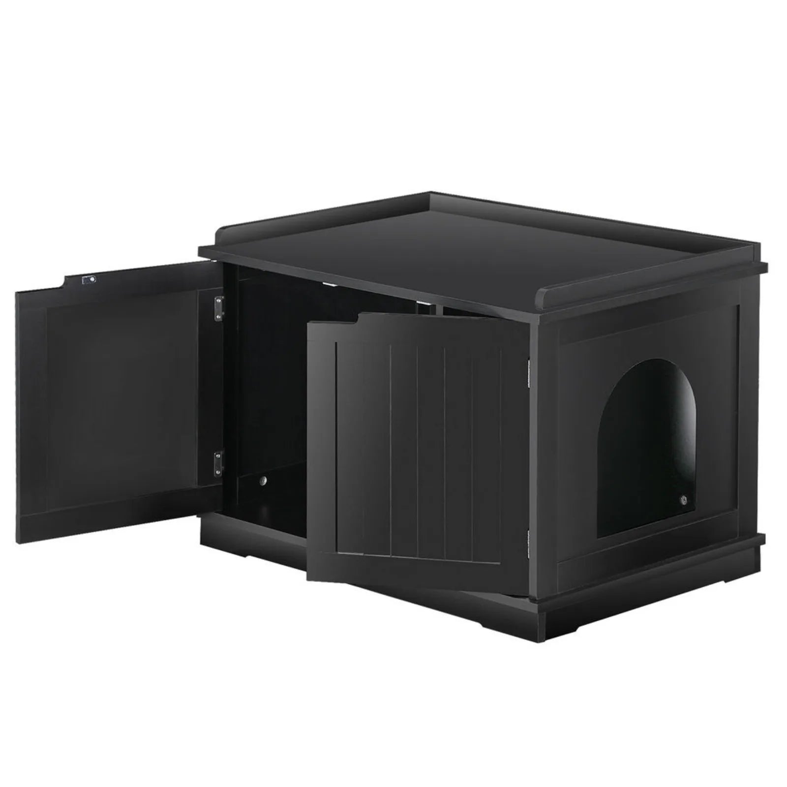 Two sections inside: The cabinet is divided into two sections by the divider,Large rooms are suitable for most litter boxes or trays, and smaller rooms are suitable for small pet mats or beds.