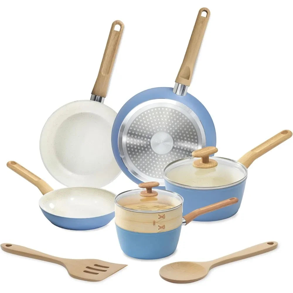 Ceramic Titanium-Infused Cookware Set,Light Blue–Pots,Pans,Steamer,Spoon&Turner–Induction Cookware Kitchen Pots Pans Set