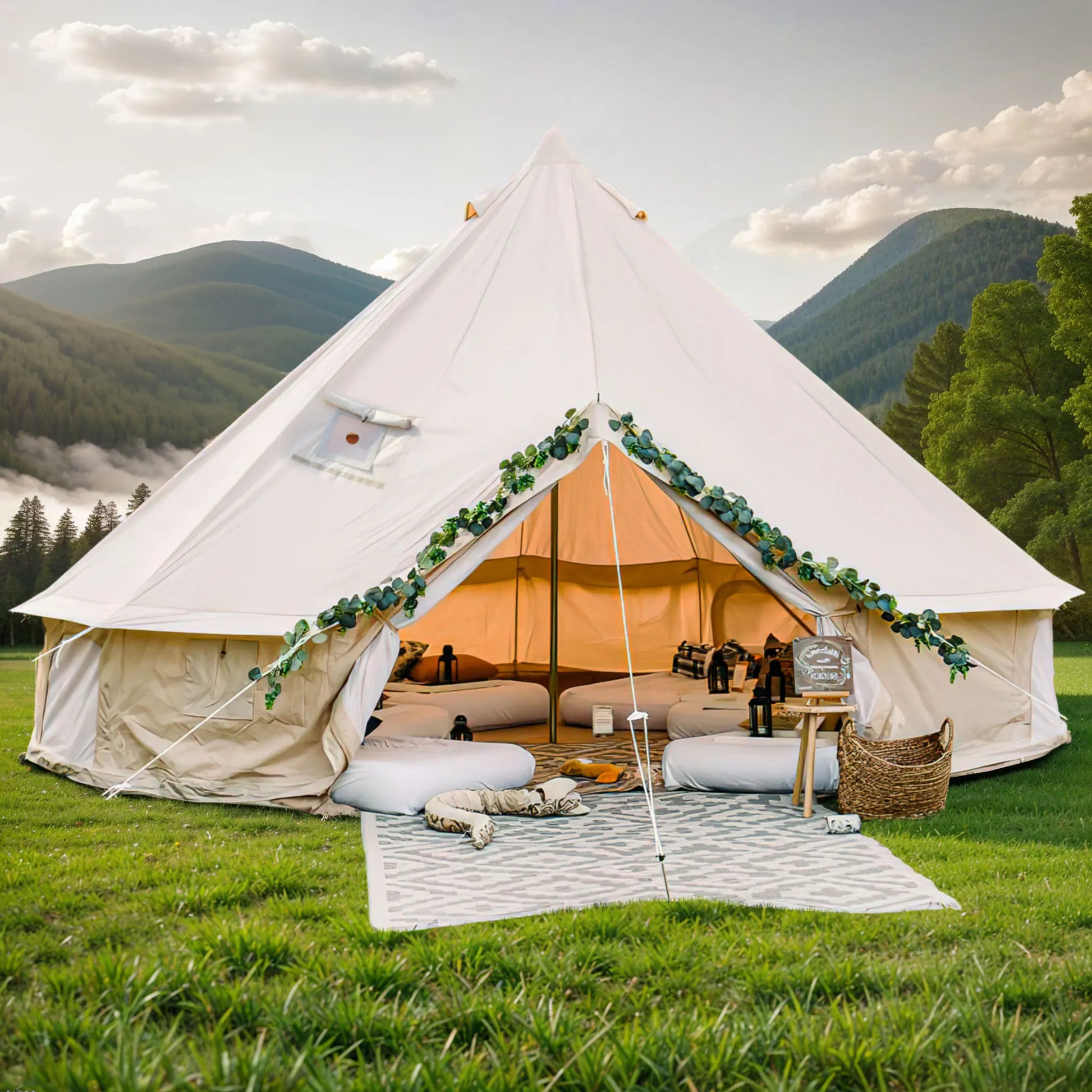DescriptionHIGH QUALITY COTTON TENT- Waterproof camping tent use cotton fabric and 500g woven PVC fabric at the bottom; The premium fabric features better waterproof and windproof effect to provide you with an optimal sleeping experience; Premium metal zipper doors and wind ropes effectively secure the tent and extend its service lifeSEALED TOP STOVE JACK - Camping tent is equipped with a reserved 9.5x9.5in sidewall vent, and a 2.16in diameter reserved hole for top stove extension, and is made from high-temperature resistant silicone material with good elasticity to prevent leakageEXCELLENT VENTILATION- 3/5/6/9-person bell shaped tent is equipped with 1 door and 4 side wall windows, as well as two ventilation windows at the top to facilitate air circulation and prevent foreign objects from entering; Stay cool and comfortable inside the tentSPACIOUS INTERIOR - 9.8ft /13ft/ 16.4ft/ 20ft tent is spacious enough for 3-10 adults to move around in; The side wall panels are detachable so you can freely choose whether to install them; Stay cool in summer and warm in winterPICNIC CAMPING - Glamping camping tent comes with a portable handbag that can accompany you everywhere and make storage more convenient; 12 small ground nails and 10 ground nails ensure the tent's total stability; Wind resistant and sturdy for you to have a worry-free experience during any camping and picnicSpecification:Diameter:3M/9.8FT 4M/13FT 5M/16.4FT 6M/20FTProduct Care Instructions:Machine WashIncluded Components:10 Ground Nails, Ropes, 12 Small Ground NailsFabric: 100% cotton canvas, PU coating, water proof, mildew resistant.Water Resistance Technology:1000 mmNet: 40gsm white, both on door and windows.Recommended Uses For Product:Party, Picnic, Camping & HikingSeasons: 4 Season