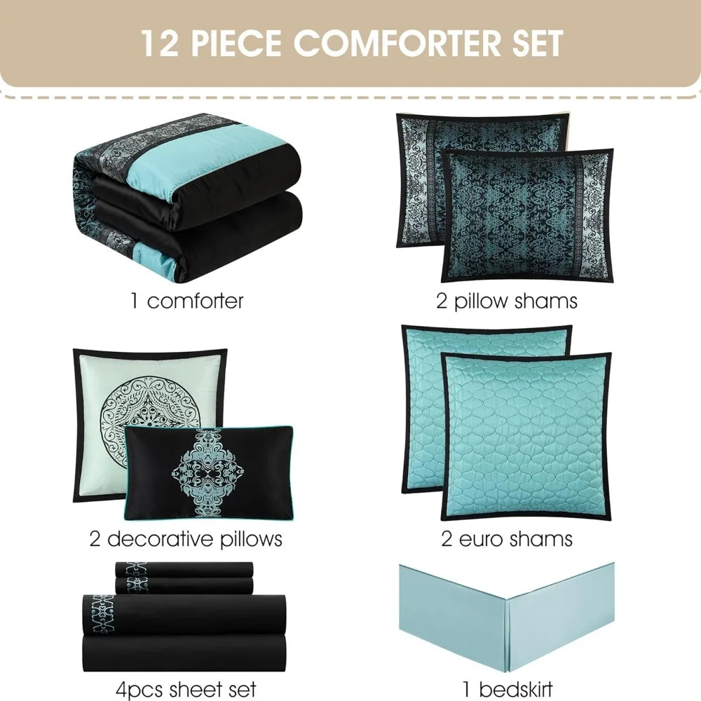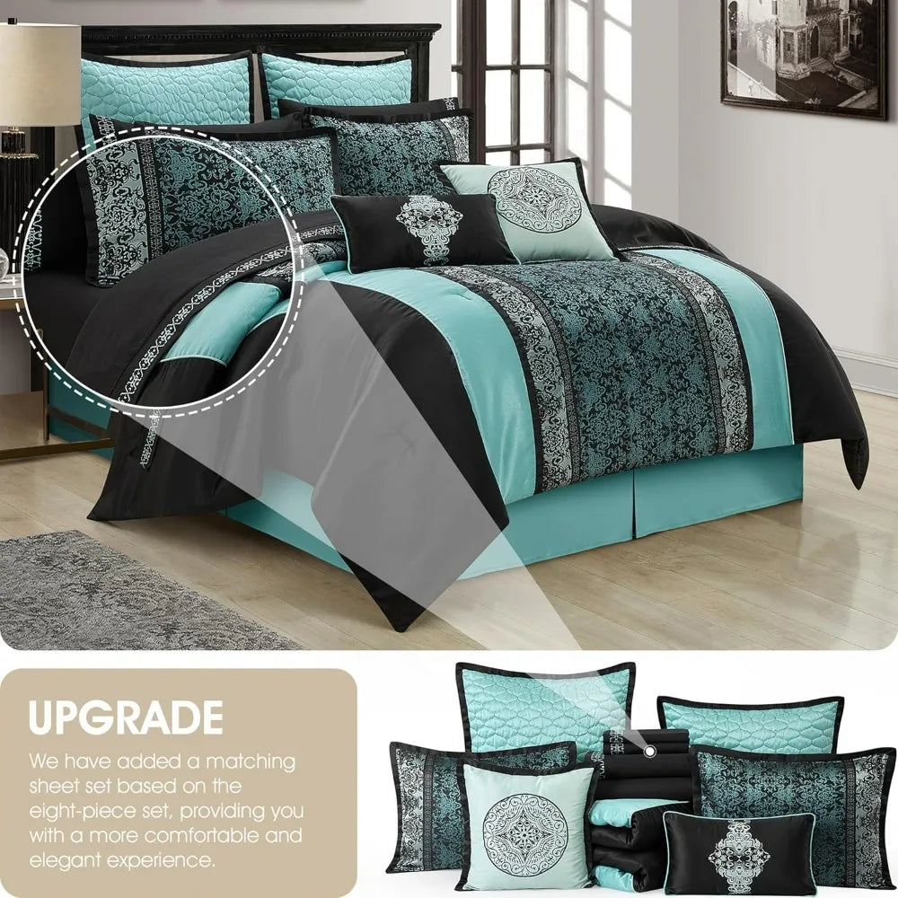- [What You Can Get] 1 Comforter- 104 inches x 92 inches, 1 Bedskirt 72 inches x 84 inches + 15 inch drop, 2 Pillow Shams - 20 inches x 36 inches, 2 Euro Shams - 26 inches x 26 inches, 2 Decorative Pillows -1-18 inches x18 inches,1-12 inches x 20 inches, 2 Pillow Cases - 40 inches x 20 inches, 1 Flat Sheet - 108 inches x 102 inches, 1 Fitted Sheet - 72 x 80 + 14 inches height