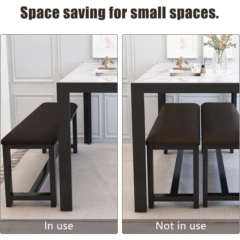- 【Space Saving Dining Table with Bench】This dining table set contains a table (47.24*27.56*30.71 inch) and two benches (40.55*11.81*17.72 inch), two benches can be tucked under the kitchen table to save space, perfect for small spaces, small apartments, small kitchens, small studios, and more.