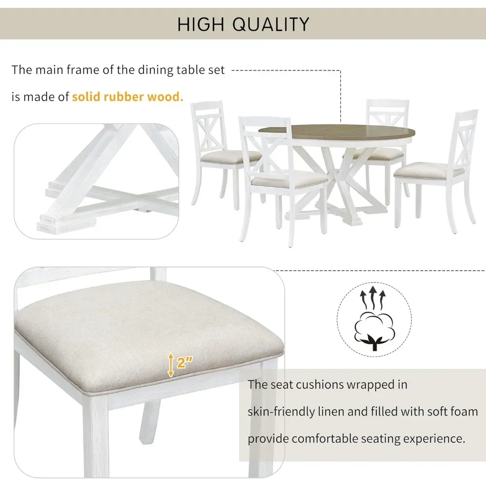 - [High Quality Material] This vintage 5-Piece dining table set with wood pattern has good quality and adds understated elegance to your dining room. The main frame of the dining table set is made of solid rubberwood to ensure stability and durability for daily use. Round table with 4 chairs that wrapped in linen as the seat cushion and filled with soft foam to provide you with a comfortable sitting experience. The weight capacity of the kitchen table and chair is separately 661 LBS and 330 LBS/PCS.