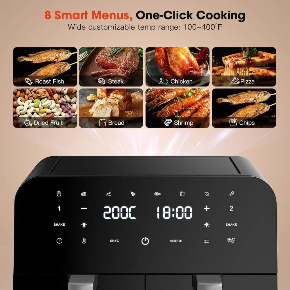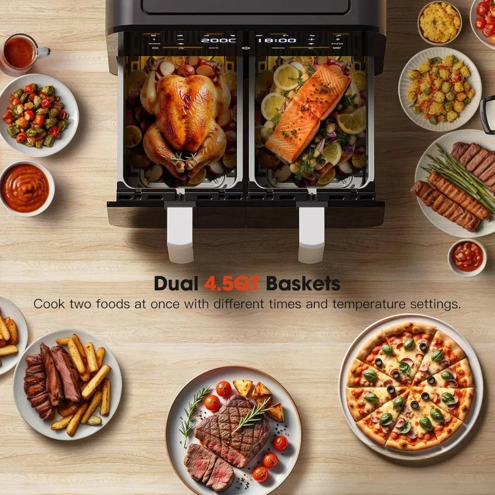 - 【Dual Air Fryer with Two Baskets】 Featuring an impressive 9.5Qt capacity with two independent 4.25Qt cooking zones, this Dual Basket Air Fryer is your gateway to simultaneous, diverse culinary creations. SyncCook lets you cook both baskets with the same cooking settings; SyncFinish lets you program baskets with 2 different settings to automatically finish at the same time!