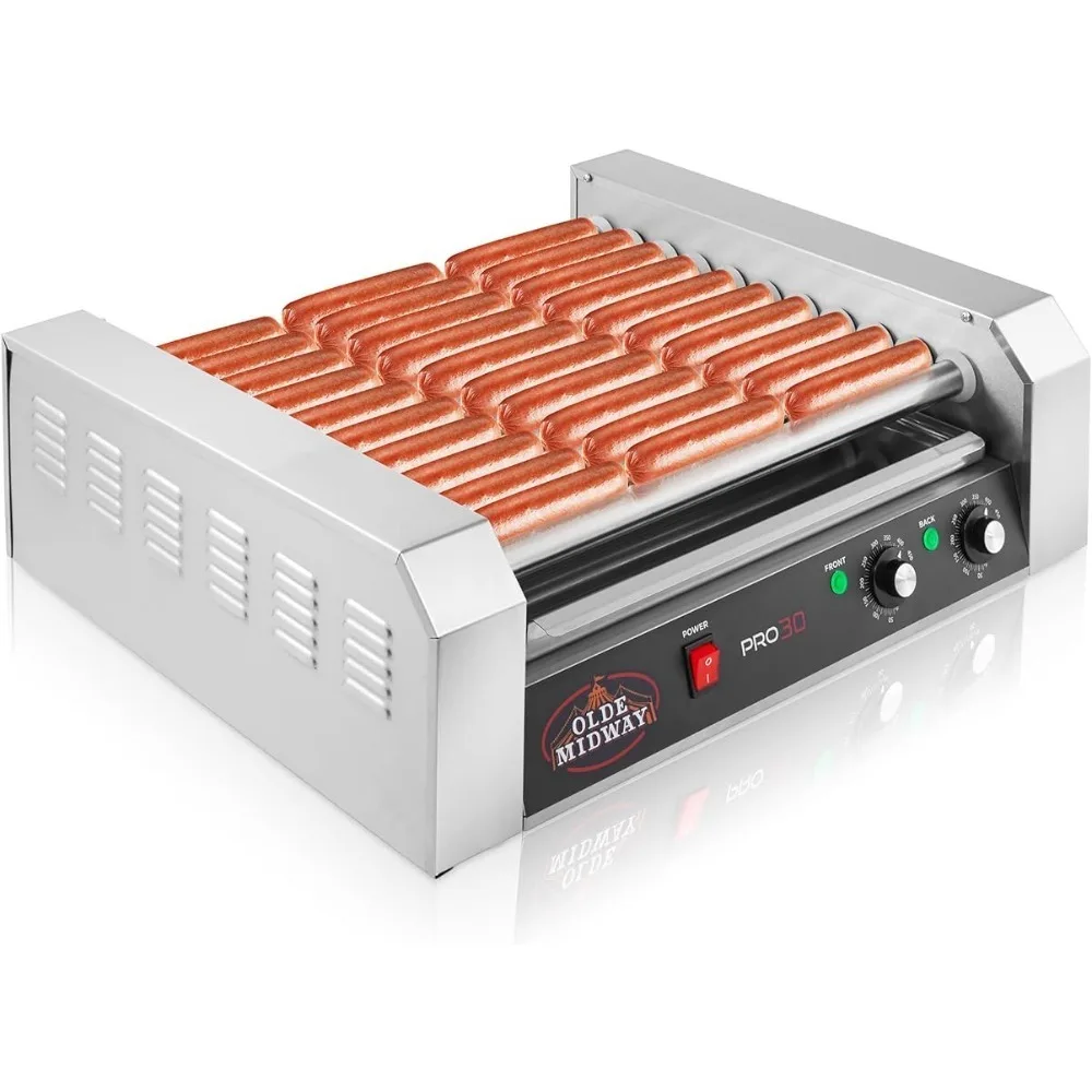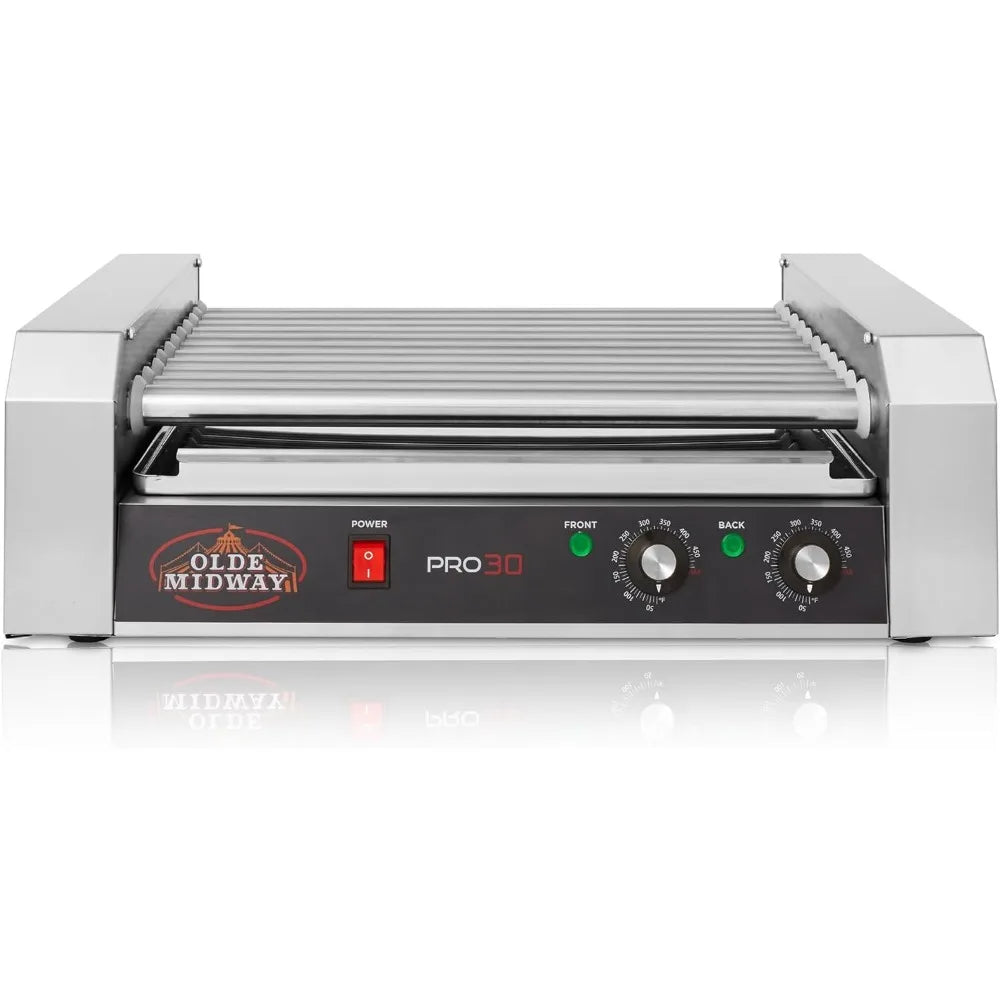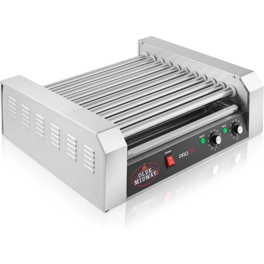 The electric hot dog machine from Olde Midway makes it easy to prepare mouth-watering rotisserie style hot dogs, conveniently cooking up to 30 hot dogs at once on its 11 stainless steel rollers.