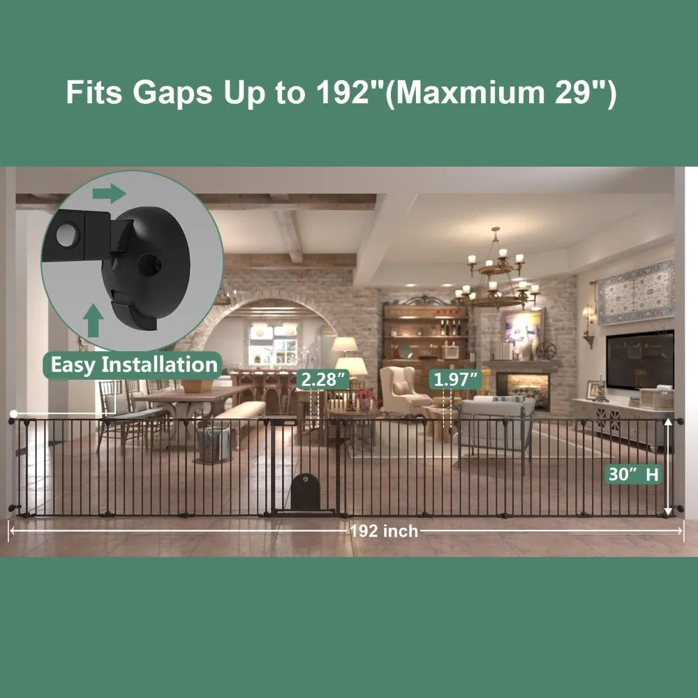 - 【Superwide】Baby gates extra wide opens up to 192 inches wide and stands 30 inches tall. (2.2'' wide bars gap, prevents your pets from squeezing through). The long dog gate is great for big houses, wide spaces, angled openings, hallways, doorways, stairs, and barriers.