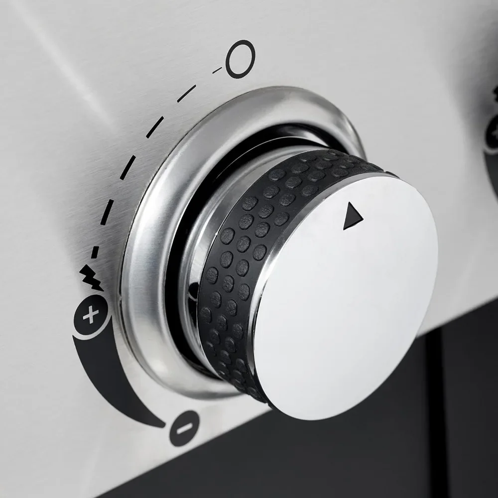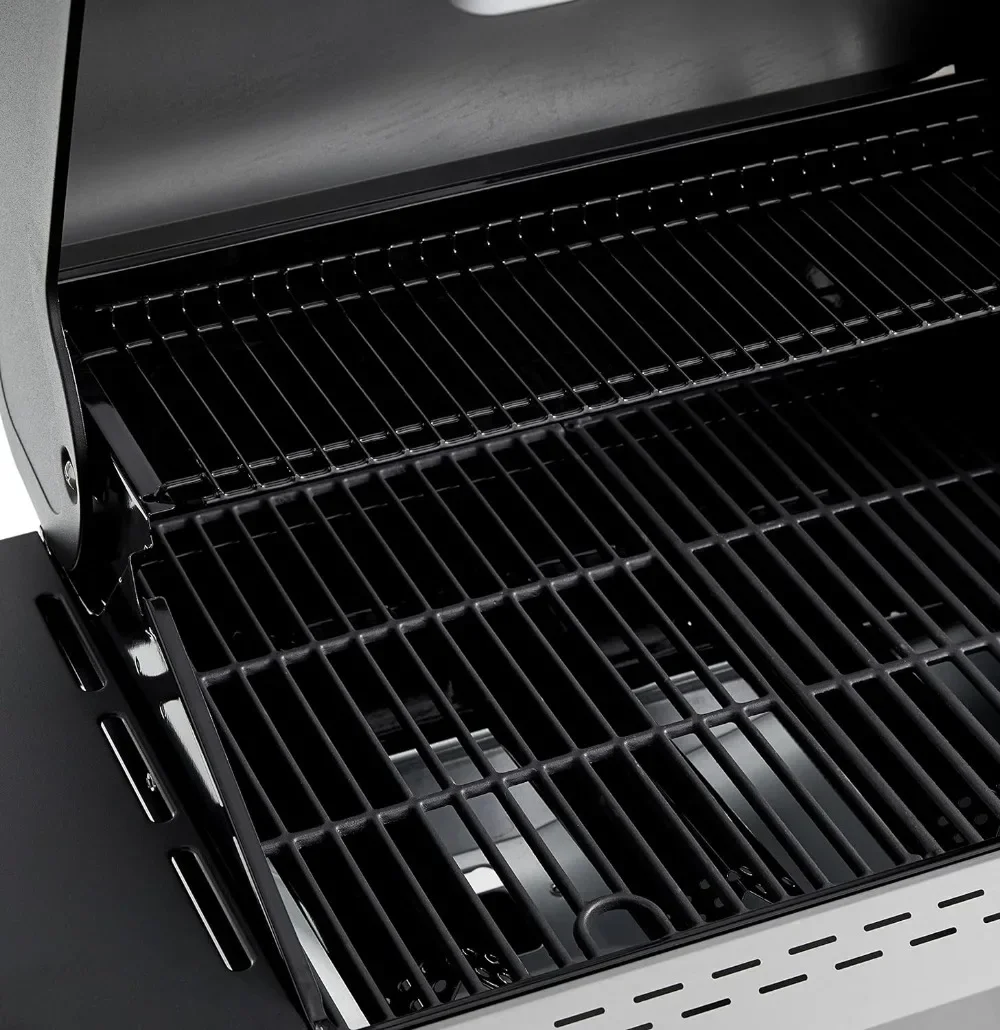 - Porcelain-coated warming rack and cast iron cooking grates promote easy food release, rust resistance, and quick cleanup