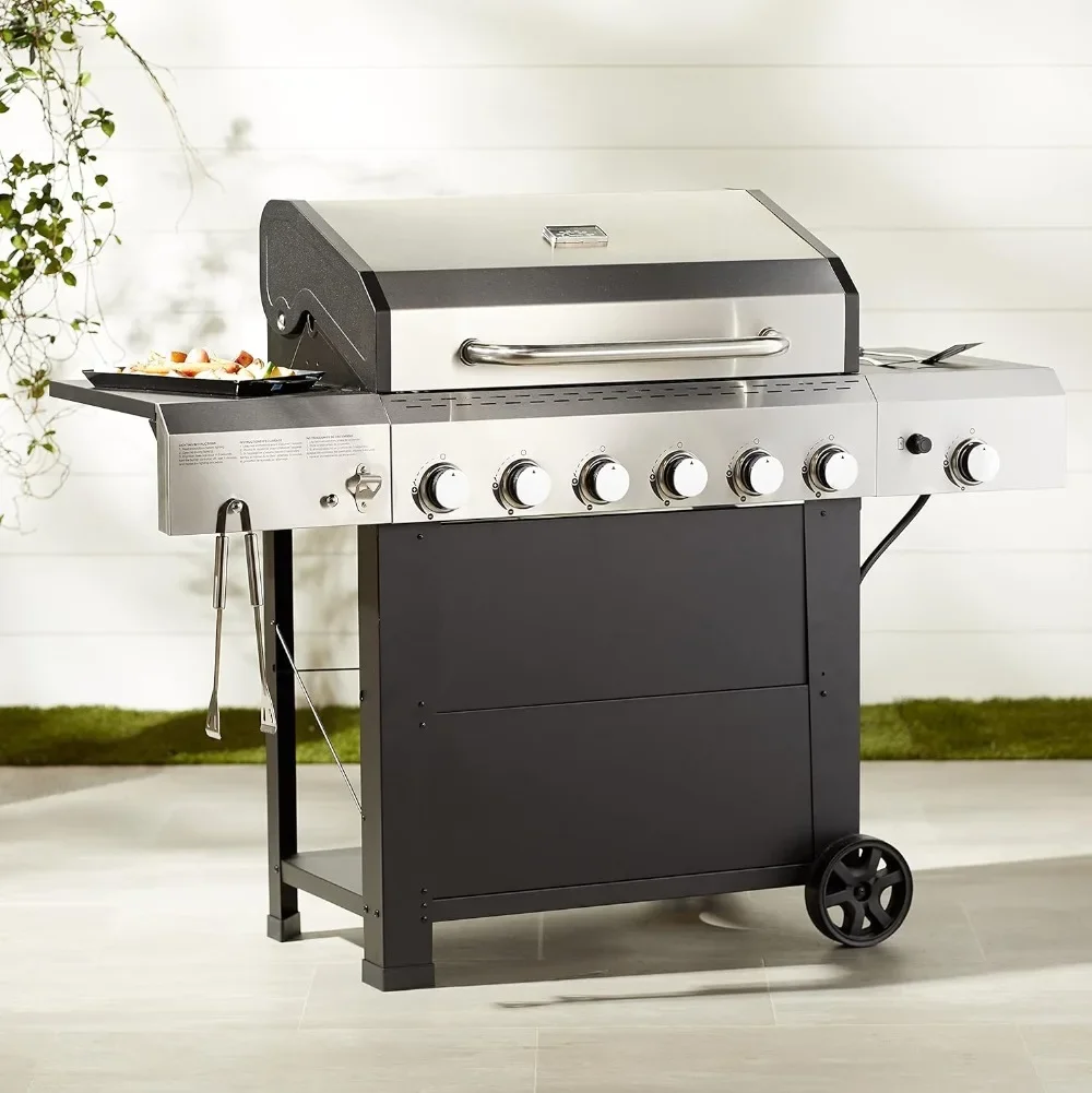 - Includes a gas grill with 6 burners, 1 side burner, a warming rack, and a removable grease tray; LP not included