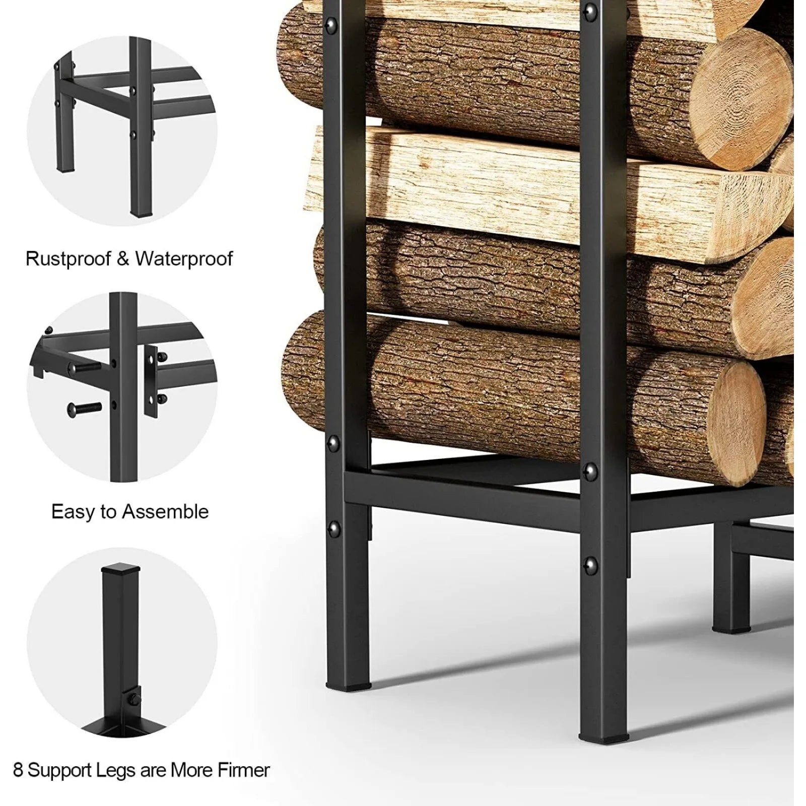 【Easy to Assemble】This freestanding stove fireplace log storage rack is simple in structure. The package comes with screws and a spanner for installation. Without using any other tools, just need needs few minutes to piece these brackets together to make your durable and sturdy outdoor firewood rack.Suitable for all-weather outdoor courtyards, this firewood rack is the best choice.
