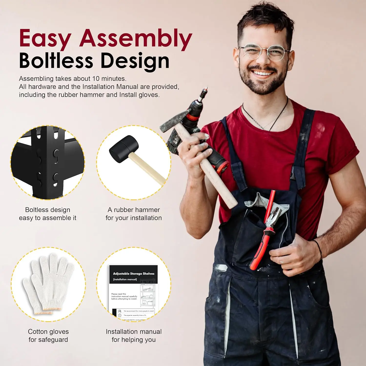 - 【 EASY TO ASSEMBLE 】 This 5-tier black storage shelves comes with a rivet lock design and includes a post coupler without needing any nuts or bolts. Easy installation with just the included rubber hammer, assembling takes approximately 10 minutes