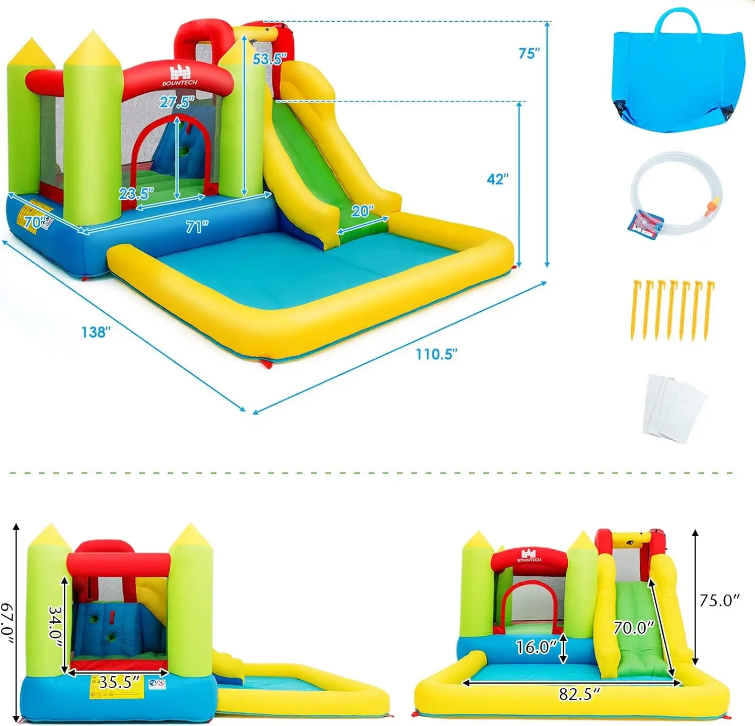 - 【Sweet Accessories】 In order to meet your needs better, we have provided you with some accessories. A hose assembly kit for added enjoyment, a carrying bag for easy storage and transportation. 7 bouncer stakes for ensuring the stability and firmness, 4 repair patches for easy maintenance.
