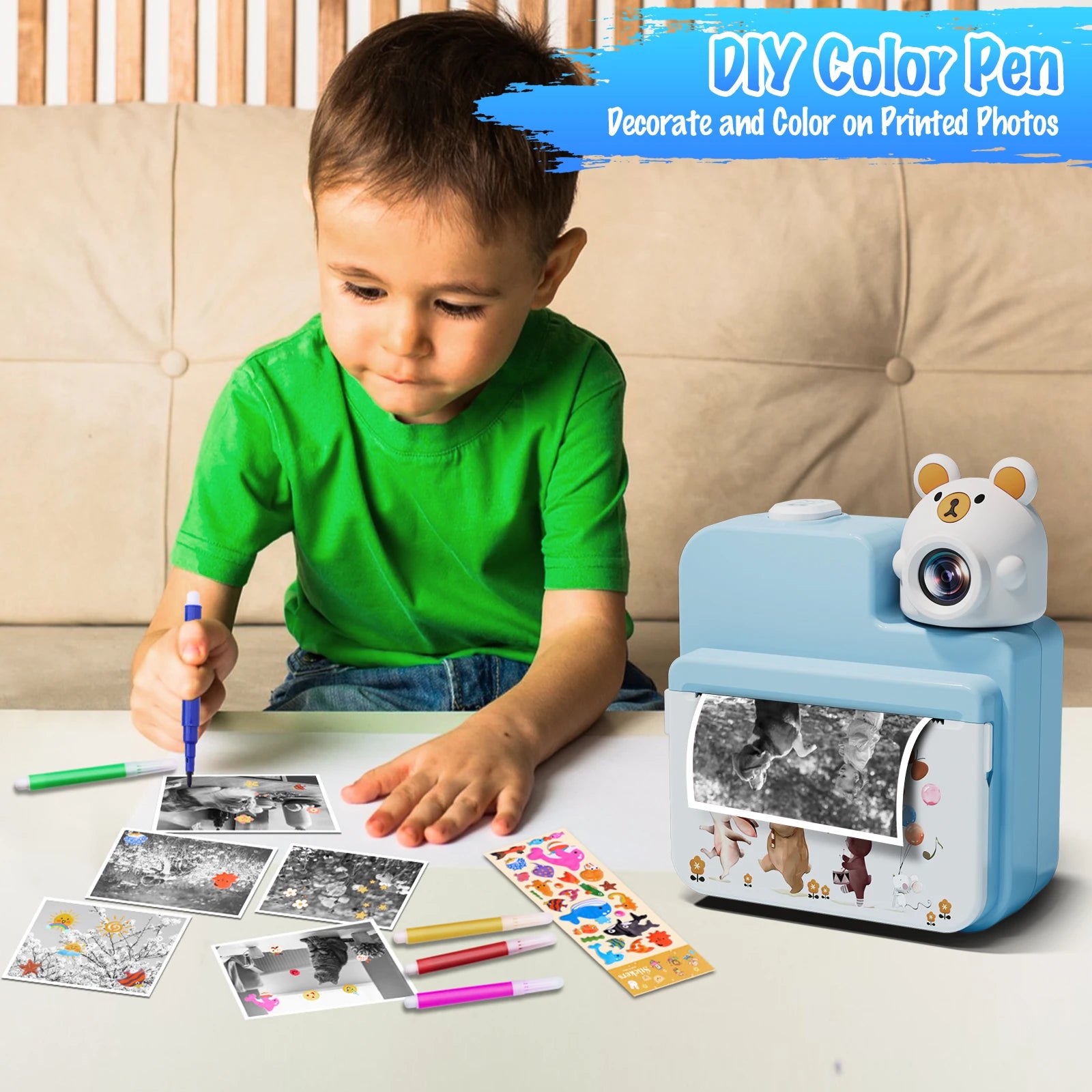 【180° Rotation Magical Instant Print Camera for Kids】 Experience the joy of instant printing with a 180° rotatable lens! This digital camera allows kids to instantly print cherished moments with a simple press, accompanied by funny photo frames and filters. Designed for boys and girls aged 3-12, it's a gift that sparks creativity and delight. The package includes 5 colorful pens for imaginative doodles.