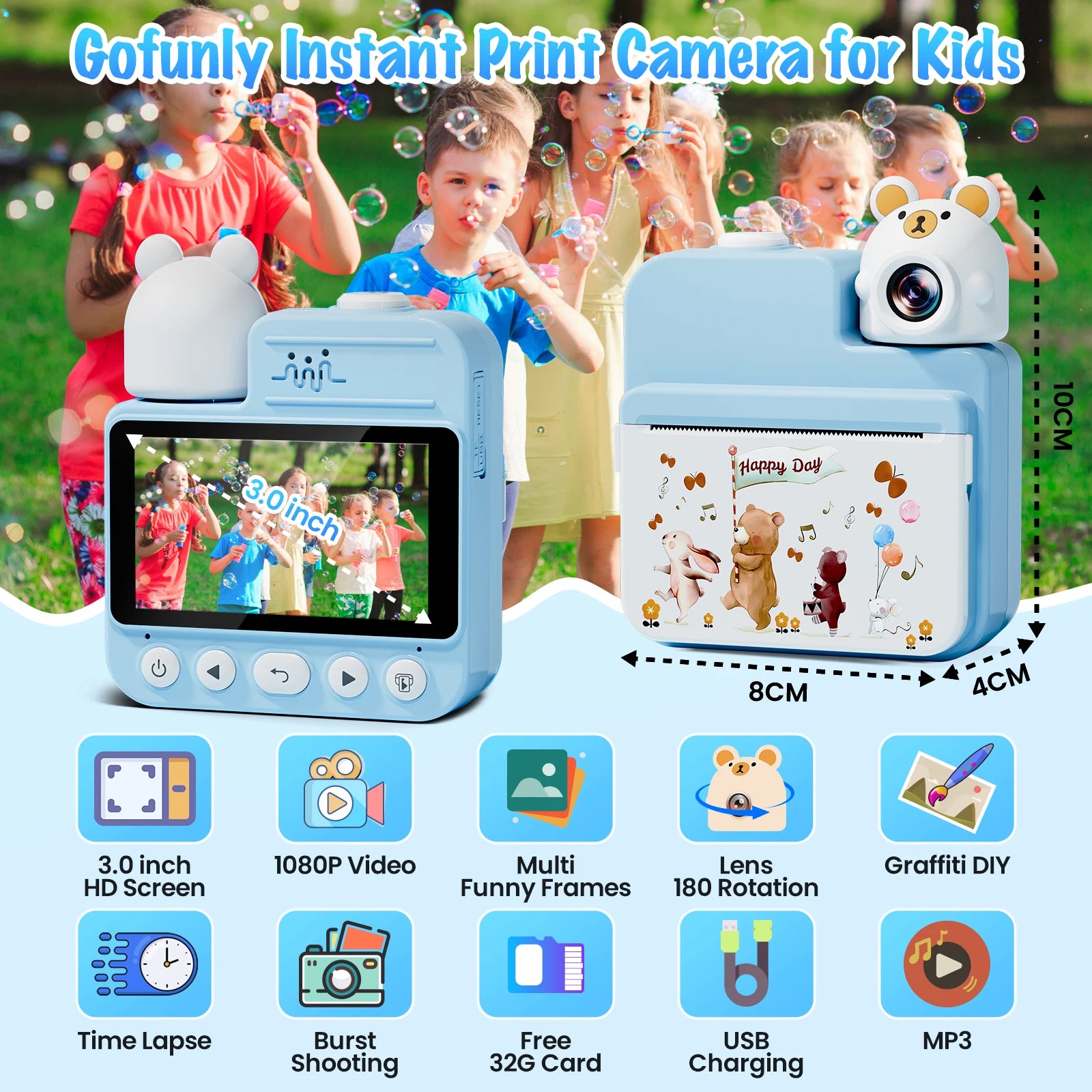Kids Camera Instant Print, 3.0'' with 32G Card & 3 Print Paper, 1080P HD Kids 3-12 Years