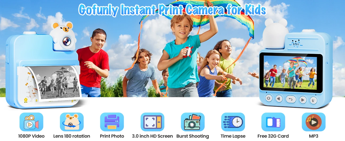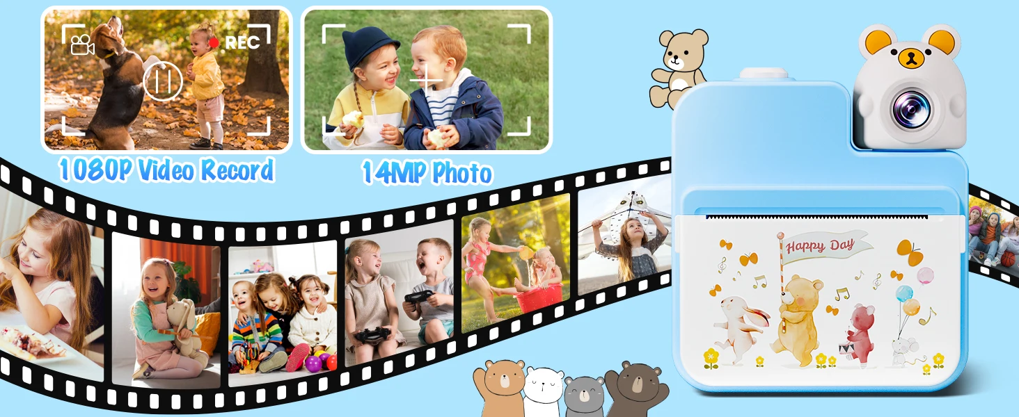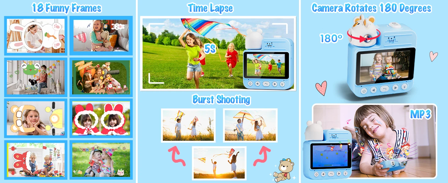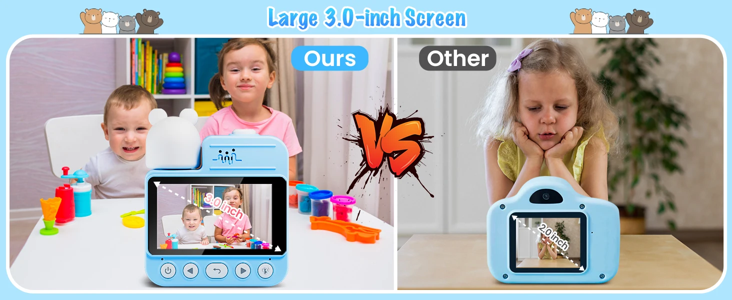 【3.0 Inch Large Screen Kids Camera】 Kids instant print camera is equipped with 3.0 inch IPS screen, supports 14MP Original Photo Shooting, 1080P Video Recording, Time Lapse Photo, Recording at Burst, Cyclic Recording, Funny Photo Frames and Different Filters and Others (Auto Power Off, Screensaver, 4 Games, etc), record every significant moment of childhood.