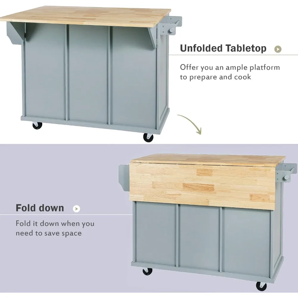 Kitchen Cart on 5 Wheels with Storage Cabinet, Mobile Island with Rubberwood Drop-Leaf Countertop