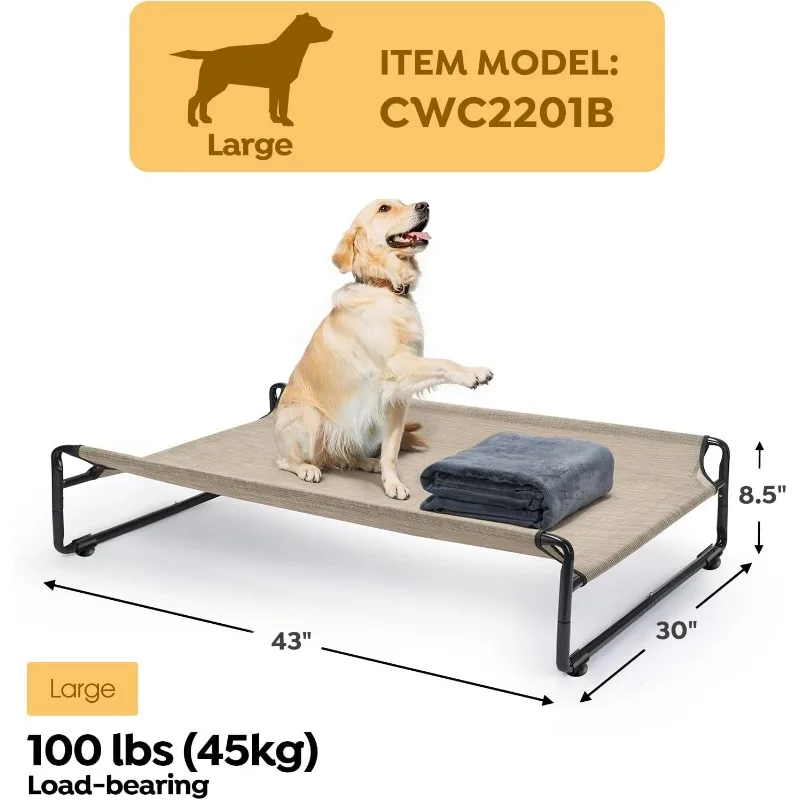 - Large Elevated Dog Bed. Composed of powder-coated steel and textilene mesh and flannel dog blanket. 43"L x 30"W x 8.5"H (109x76x22 cm), fits up to 110 lbs(50kg). Upgraded rubber anti-skid feet can grip the floor better.