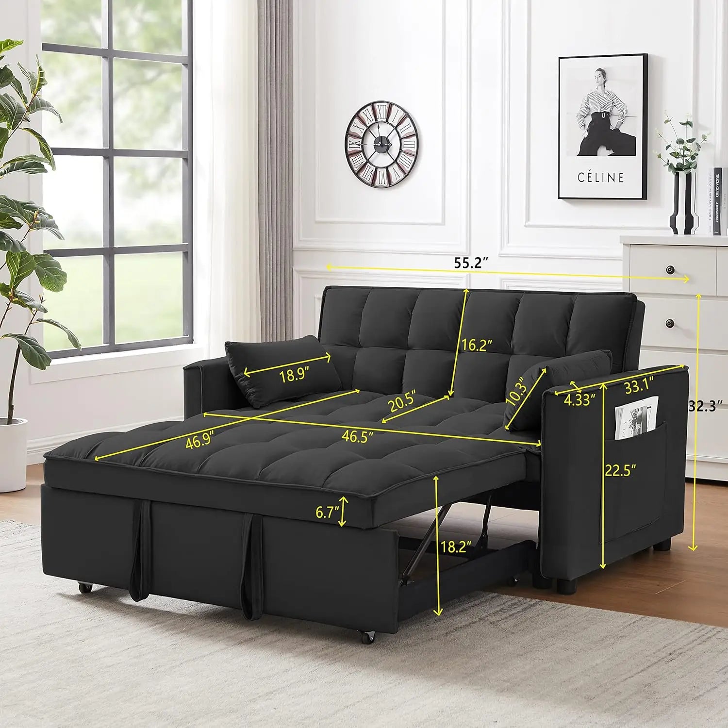 - Pull Out Sofa Bed - This loveseat can become a pull out sofa bed within seconds with two straps assist in pulling out and quickly turning the sofa into a bed to take a rest. It can be placed in living room to watch TV, play games or reading, it can also be used a guest or child bed to save space for compact design.