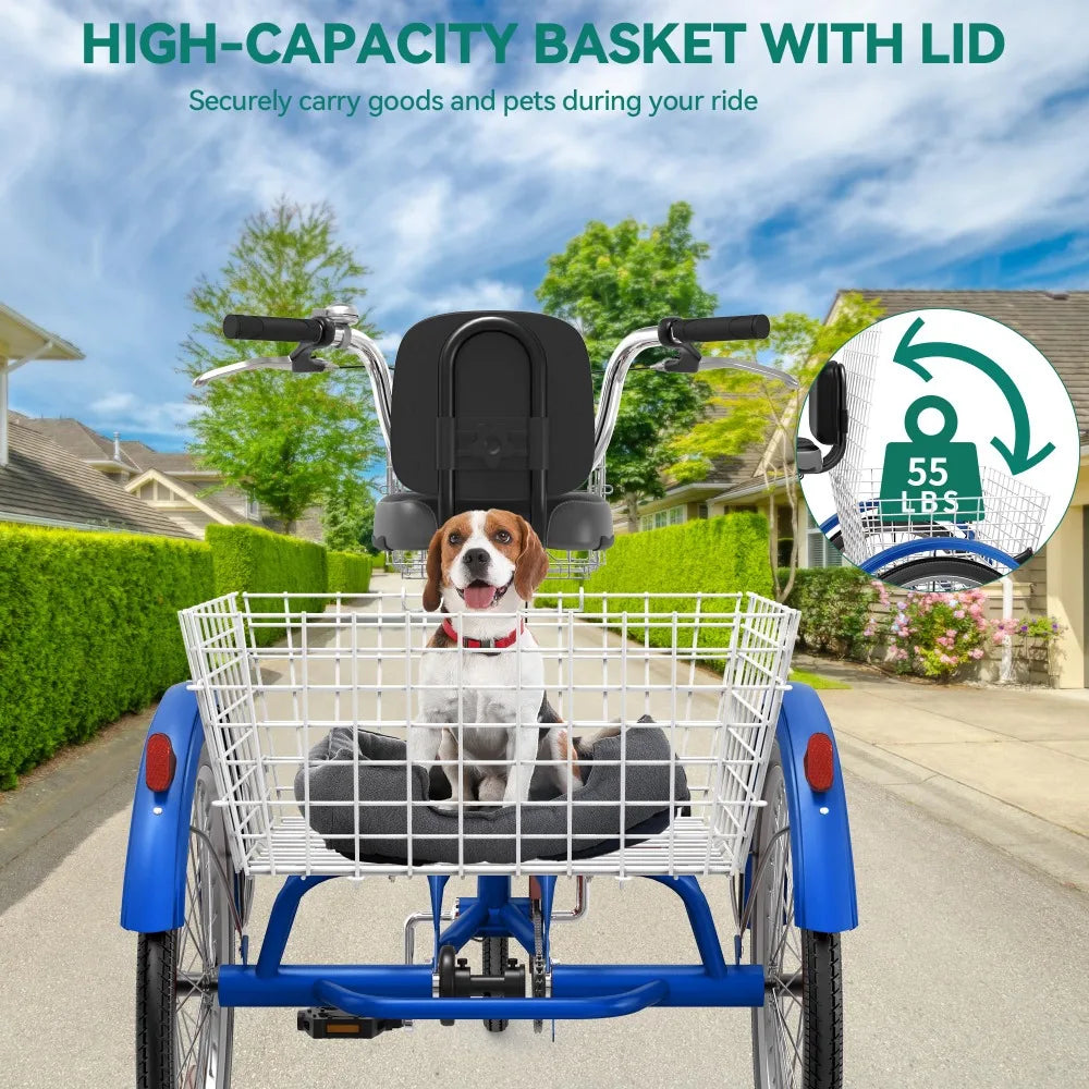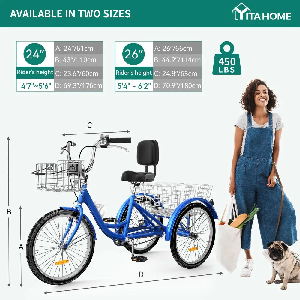 New Adult Tricycle, 24 & 26 Inch 3 Wheel Bikes, 1 Speed Bike for Adults with Removable Baskets,
