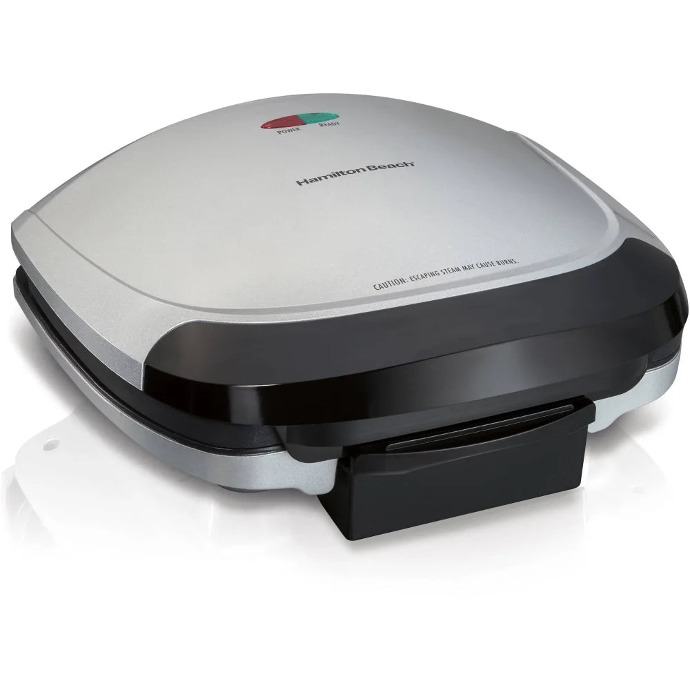 Enjoy delicious grilled foods year-round with the Hamilton Beach Indoor Grill. The large 90 square inch nonstick cooking surface can accommodate up to six servings, an ideal size for family meals and parties. Equipped with powerful heating elements, this indoor grill cooks most foods in 10 minutes or less, making it perfect for quick weeknight dinners. Use it to grill burgers, boneless chicken, lean meats, fish and vegetables. Designed so grease drips away from the food as it cooks, the Hamilton Beach Indoor Grill makes low-fat cooking easy. Plus, the convenient slide out drip tray is dishwasher safe. The large handle offers a secure grip while cooking, and the floating hinges adjust to the thickness of food. When finished, the nonstick grill plates easily wipe clean.