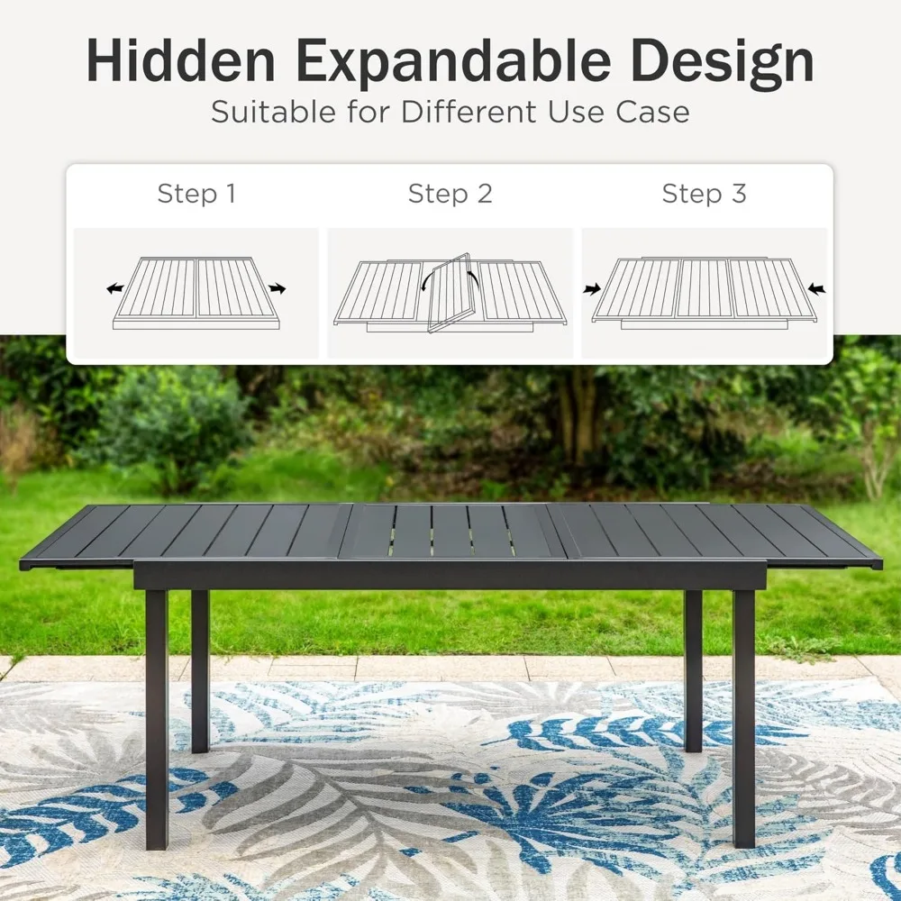 - Extendable dining table: metal dining table with thick metal slats, rust and weather resistant. The expandable design can easily transform the table for 6 to 8 people, convenient and useful. Non-slip mats for uneven floors and against scratches on the floor.