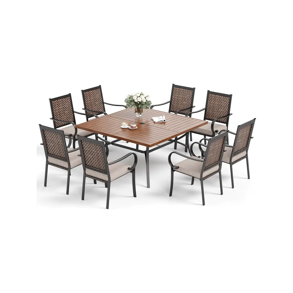 - 【A 9-Piece Durable Dining Set for 8】Includes 1 large square metal patio dining table and 8 wicker patio dining chairs. It fits perfectly in your backyard, pool, balcony, porch, garden and terrace to create an outdoor comfort zone for you. Escape every day and find serenity in our outdoor furniture oasis!