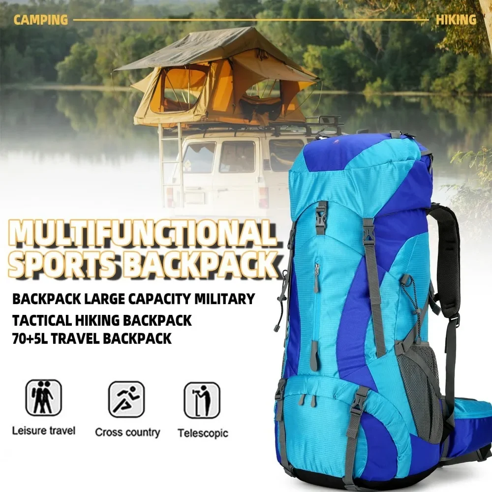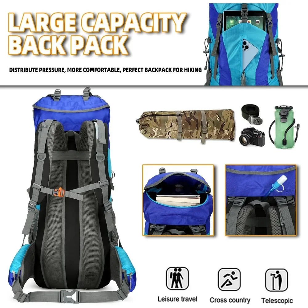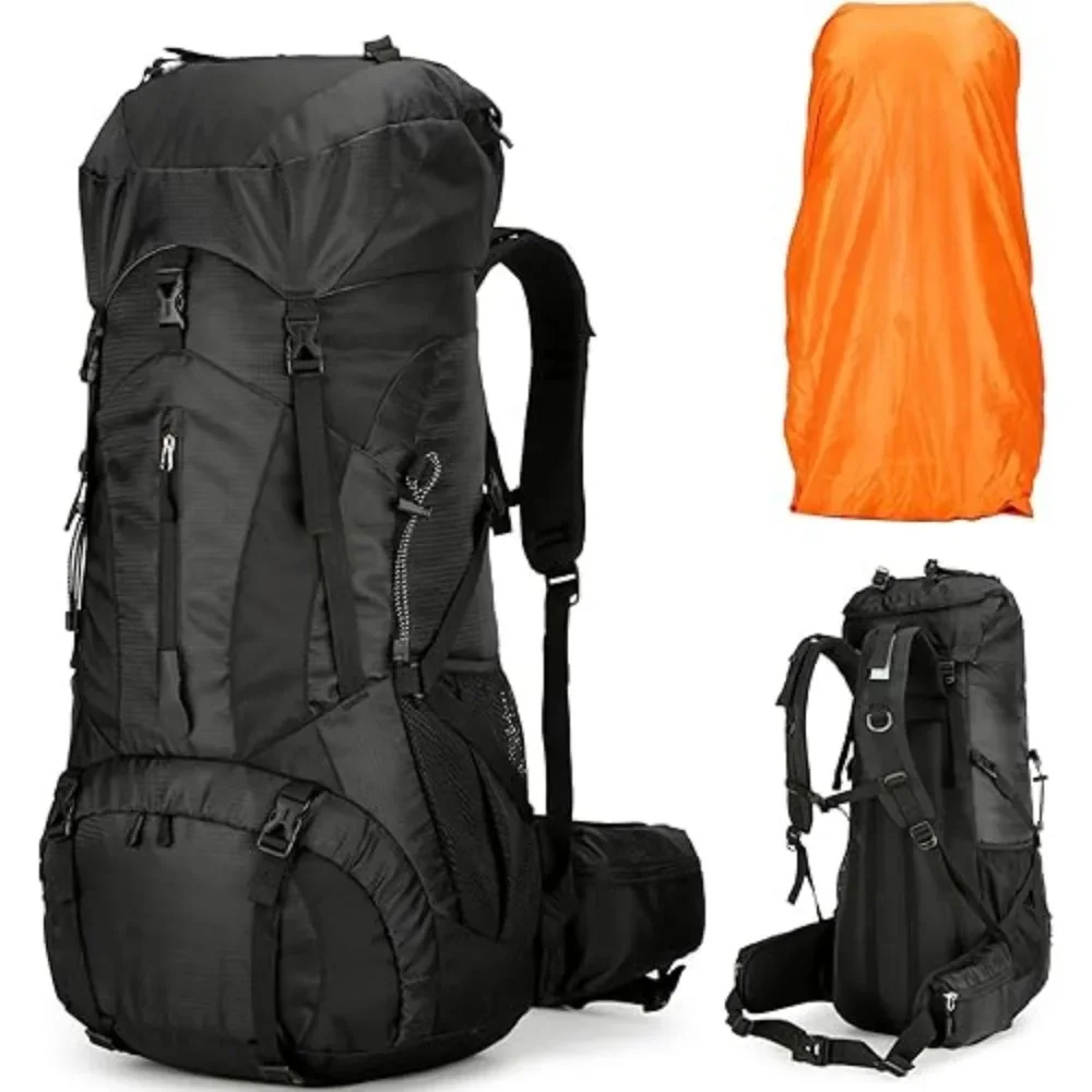 LARGE HIKING BACKPACK: The hiking backpack with rain cover is made from lightweight, waterproof nylon fabric with durable smooth zippers. The top of the main pocket is designed with elastic drawstring which can expand for more storage space to 80l.