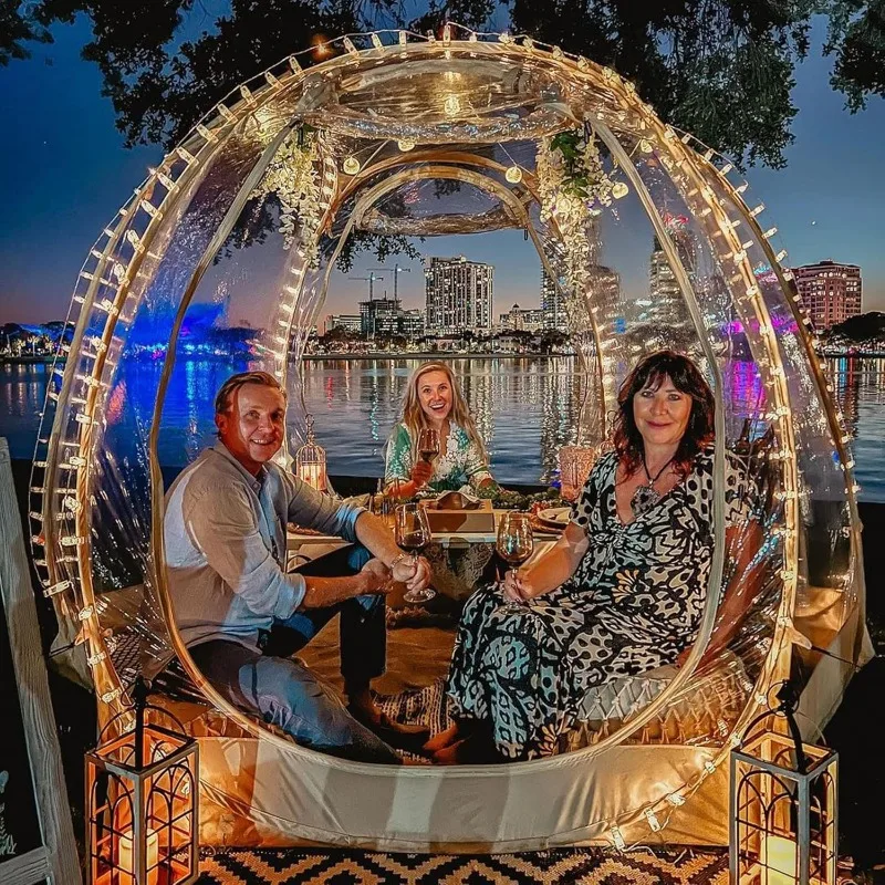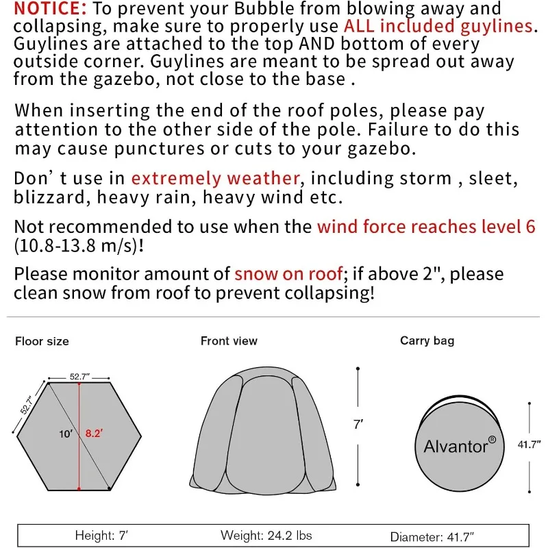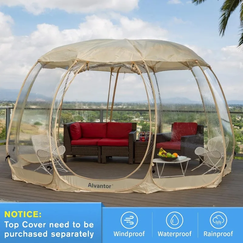 - SPACIOUS AND WARM: Alvantor big bubble gazebo provides a spacious interior shelter that comfortably fits between twelve and fifteen adults. Enough room to place various pieces of furniture so you can give your bubble tent a homely feeling. The ten, transparent PVC windows provide 360° view of your surroundings, whilst the inside of your bubble tent stays warm thanks to the excellent heat retention.