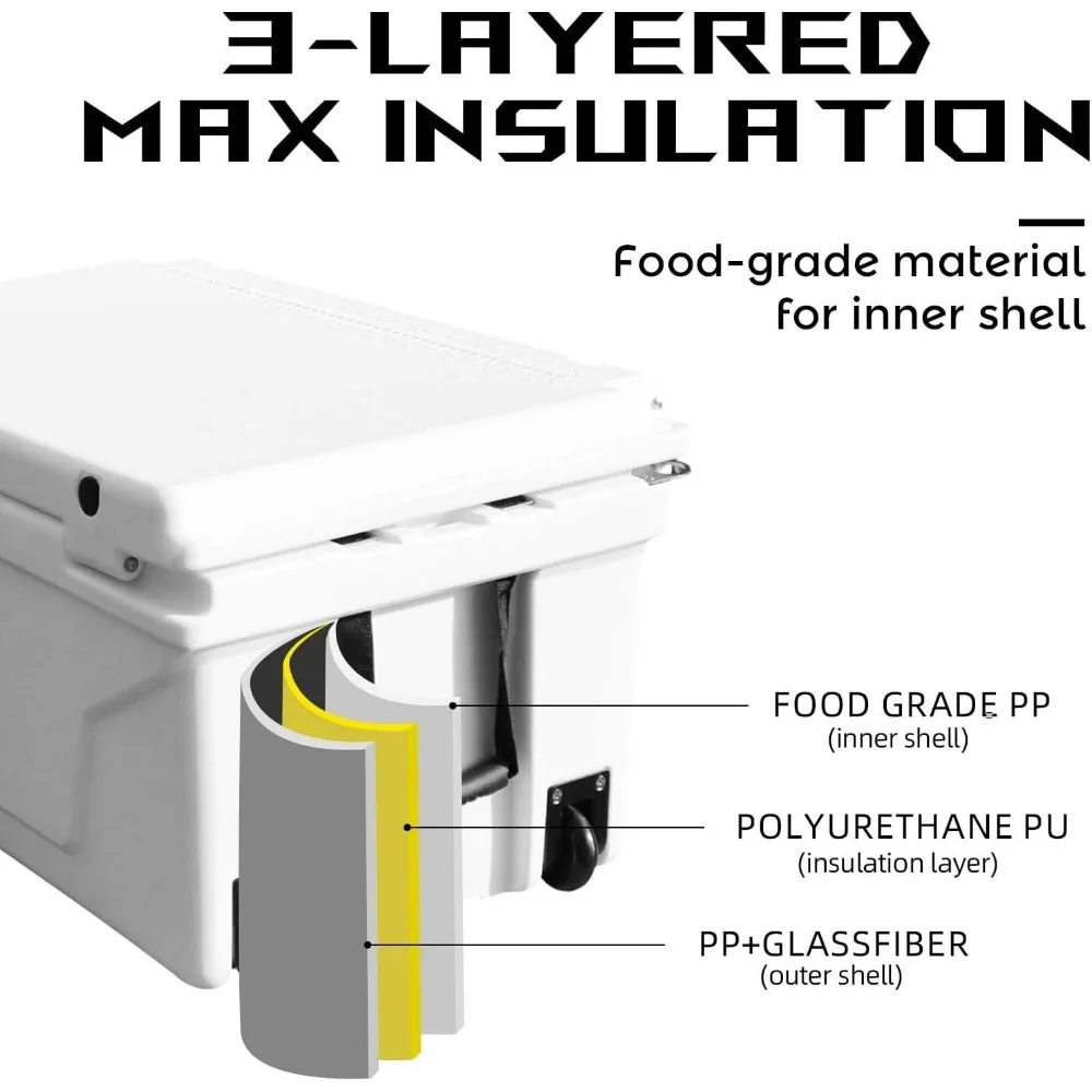 5Days Ice Retention: With the heavy-duty rubber latches and upgraded 3-layered insulation material, the cooler box is able to keep food and drinks cold for an extended period of time wherever needed for up to 5 days, even in hot weather conditions