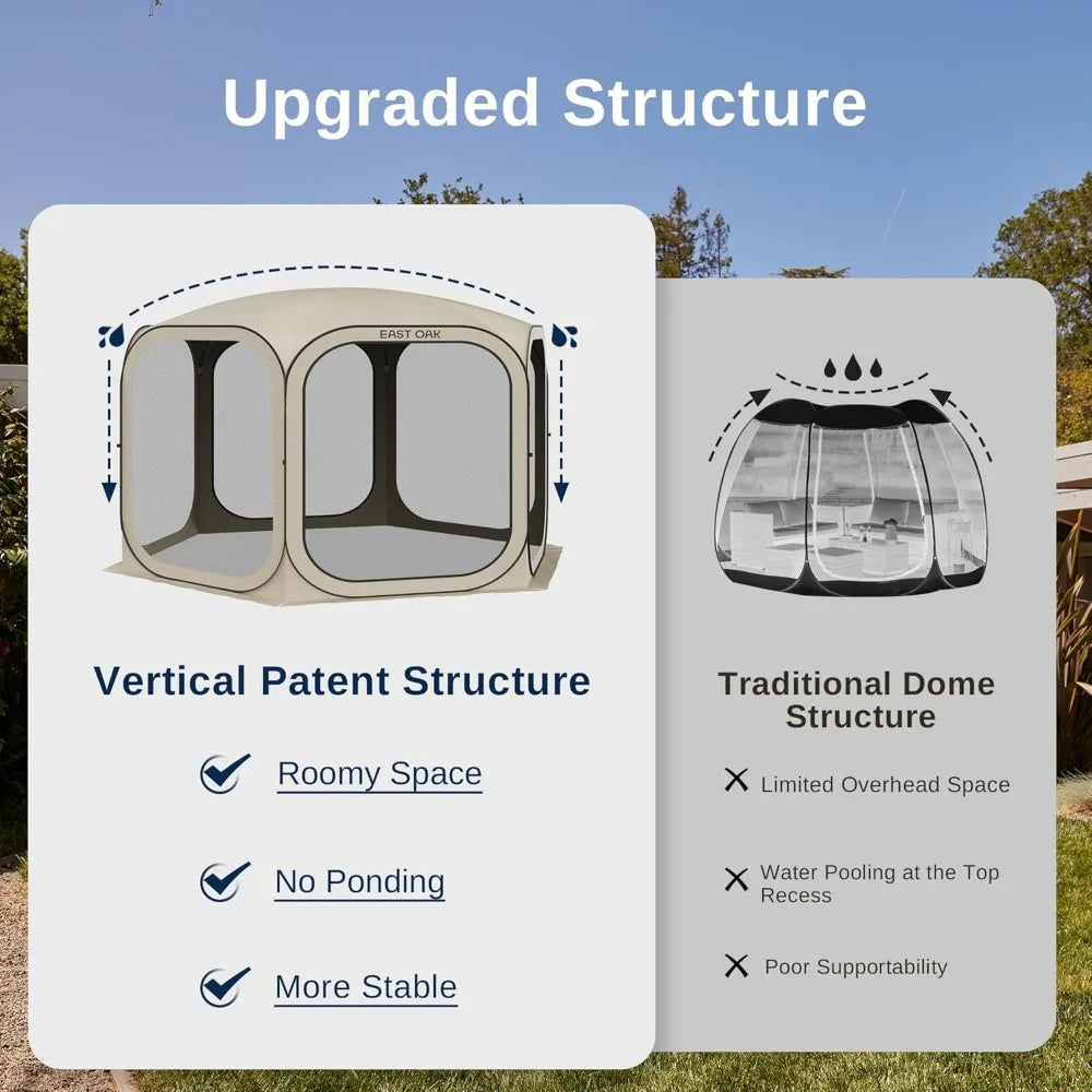- 𝗥𝗼𝗼𝗺𝘆 𝗦𝗽𝗮𝗰𝗲 & 𝗨𝗽𝗴𝗿𝗮𝗱𝗲𝗱 𝗗𝗲𝘀𝗶𝗴𝗻: This screen house frame is made of durable 300D Oxford fabric and rust-resistant steel structure. The top structure is supported by heavy-duty fiberglass, which prevents water from accumulating and delivers more space. The zipper can be used on both sides, and its connection with the tent is upgraded with doulble stitching, making it less likely to tear. The door curtain can befixed to the side for easy access