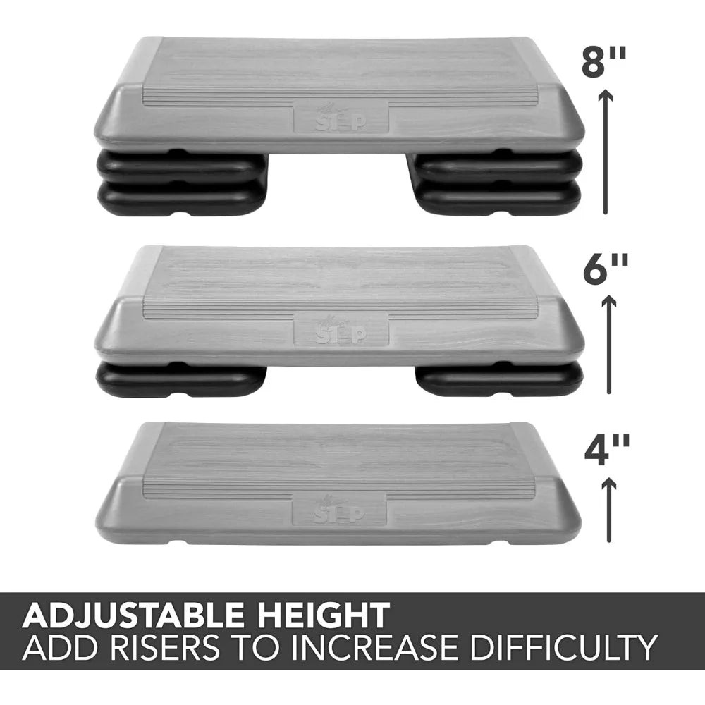 - Vary workout difficulty by adjusting platform height from 4" to 6" using risers